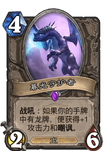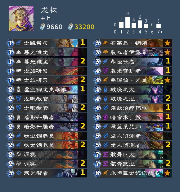 来自 主上 的一套龙牧,他以54场56%的胜率打了钻2。龙牧是一套古老的卡组,也是一代老玩家的记忆,只是如今这种按费拍怪的思路在狂野并不好用,曾经的信仰沦为了现在的娱乐卡组。 构筑方面新卡只带了两张洞察,主要凭借龙的优质身材和战吼效果进行场面交换。(以下介绍来自原作者)卡组对阵奇数骑,快攻德等铺场快攻大优,海君贼等直伤型快攻小优,对阵宇宙牧宇宙术小劣,对阵大哥牧大劣。单卡方面,当年的暮光雏龙和龙眠教官在现在看来也是身材优秀的卡牌。破晓龙的全体打三战吼是针对快攻的主要手段,3血与2血在针对快攻方面有着极大的差距,而且战吼效果不会被奥秘法奇数骑反制。侦测者是打控制卡组的主力,由于卡组本身娱乐性质,强度肯定不如功利卡组,在对局中偷到宇宙牧的58,宇宙术的提克特斯、姐夫都能为对战增加不少机会。毁则是用来针对黑眼术和大哥牧。卡组有充足的前期随从和嘲讽随从用来场面交换,所以并未携带太多奶牌和法术解牌,光巢和洞察的润滑效果让回合费用打满,但千万不可起手硬留这两张,快速找到暮光雏龙和龙眠教官吃快攻才是卡组的生存手段。卡组的小核心是铜须幼龙饲养员的配合。由于牧师缺少过牌手段,饲养员这种定向补牌的方式很适合这个卡组,对阵快攻回收破晓龙和暮光守护者,对阵控制卡组回手侦查者。总的来说 ,这是一个情怀娱乐卡组,推荐给玩腻了宇宙牧和大哥牧的牧师玩家,不建议上分使用。