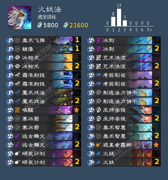 来自虎牙活化的一套洪流奇迹法(火妖法),他以56场68%的胜率打到了国服第8名。(以下介绍来自原作者)暗月竞速赛的法力饼干大大加强了奇迹法,虽然饼干奇迹法打后期卡组很强, 但是太依赖法力飓风做任务,导致打主流快攻太弱,被黑眼术和刀贼暴揍。奇迹法想要生存,必须要进化,要加速,于是作者对其进行了改良,舍弃了任务巨人的开门体系,类似复古的火妖法,主要靠火妖输出和致胜。虽然弱化了卡组打后期的能力,但是快攻抗性大大增强。