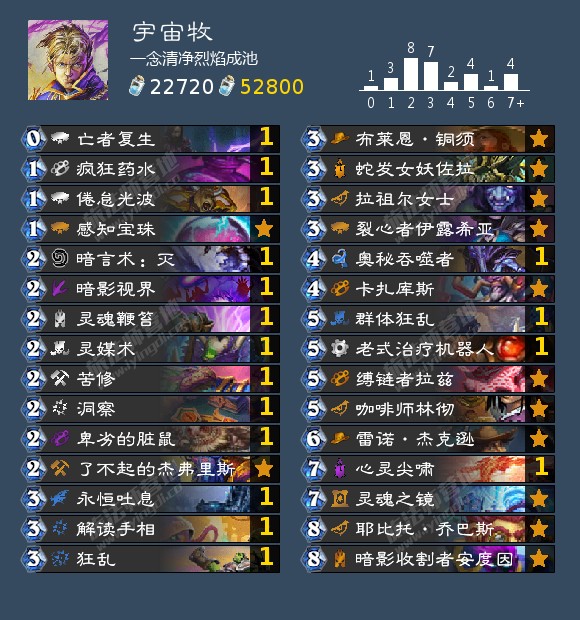 牧师:以宇宙牧为主,大哥牧为辅。对局宇宙牧,64开甚至73开的对局,和宇宙术一样是挨打卡组。为何和宇宙术相差这么大呢? 因为牧师多了裂心者和低费回手手段,火妖法还是比较怕的。