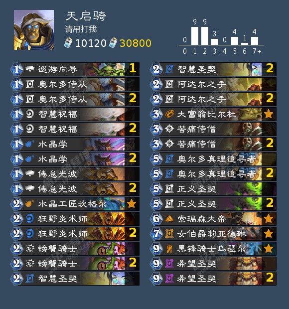 来自 请吊打我 的一套天启骑,他以71场68%的胜率打上了传说。(以下介绍来自原作者)相比之前的天启骑,这套去掉两张0费新生入学,两张二费圣光闪现,分别替换成两张螃蟹骑士和两张智慧祝福。螃蟹骑士是暗月竞速赛的巨大补强,很契合圣契体系,前期进攻性很强。螃蟹骑士的风怒配合智慧祝福也堪比小艾露尼斯,通过贴buff很多情况下能抢死卡手的大哥牧和宇宙术。当然这样的改动最大的好处还是过牌快,经常9费回合稳定变dk的同时卡组剩下四五张牌 ,斩杀基本上在十费十一费回合左右。术士准时铜须688基本上很难撕到关键牌,而且手顺的时候给对面场面压力根本不给撕牌的机会。打奥秘法也是优势,我们的过牌正常情况下比奥秘法更快,更多的资源让我们经常满血劝退奥秘法。另外打大哥牧,因为带了两张倦怠光波可以有效应对变身回合,同样是大优。对阵宇宙牧的话就是拼过牌速度,因为对面顺的情况下也是八费变身九费十费左右斩杀,比对面更快就行了,注意防一手裂心者~