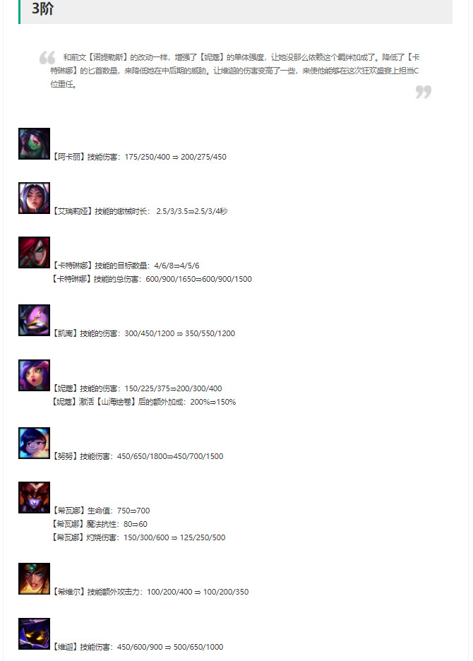 妮蔻解读:削弱,看似技能伤害增强,但阵容主打输出的时候妮蔻通常在山海羁绊里出现,额外加持直接砍了50%,削弱比较明显。