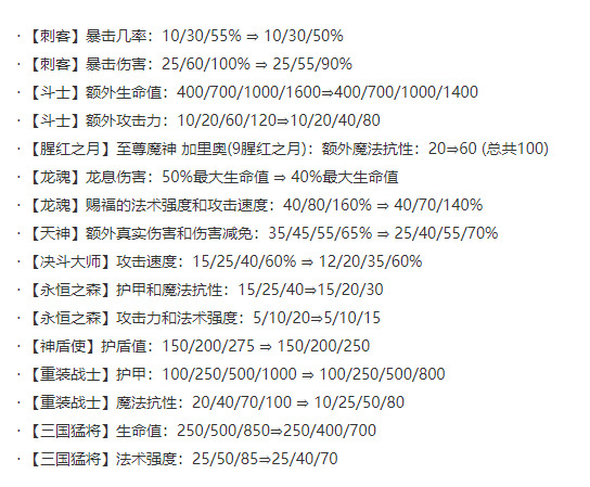 刺客解读:4刺与6刺削弱。4刺降低了5%的暴击伤害影响较小,但6刺降低了暴击率与暴击伤害削弱比较明显,但因为大部分羁绊与棋子被削弱,摩昂在PBE测试的适合6刺(忍刺)的强度感觉还是比较稳定的,感觉强度上比T2稍低一些(PBE没有排位也不敢保证)。