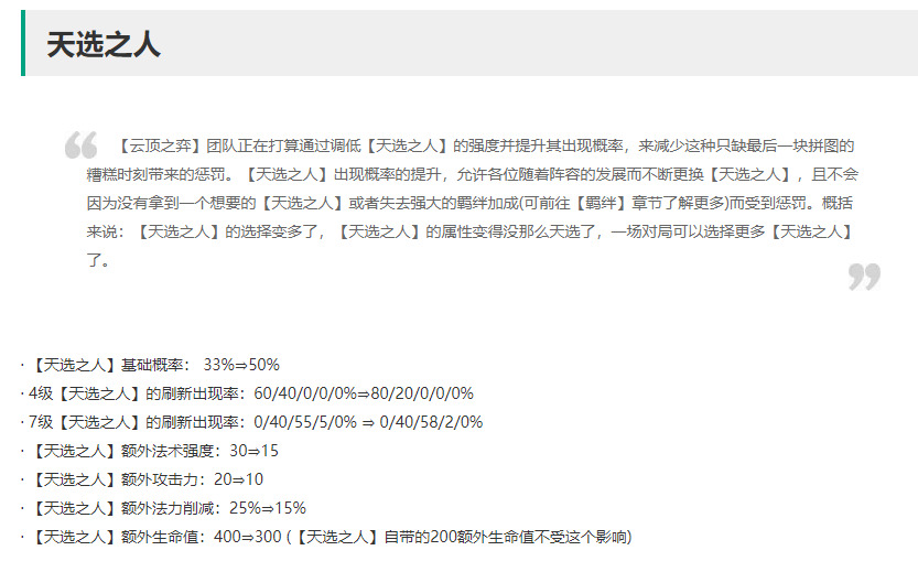 解读:天选这版本改动极大,首先天选出现概率率增加到50%,这也可以为2次D卡出现一次天选,这在对局中天选获取难度将大大降低,对局前中期天选打工会变得更加普遍,刷到自己想要的天选也会更加容易,其次4级与7级天选刷新概率改动,在4级时2费天选概率天选极大降低,在1-4或2-1上4人口的小技巧实用性变低;7级再次削弱4天选天选刷新概率,变为同S4赛季末期一样,这样在7级搜到4费天选概率微乎其微,想获取4费天选一定要上8级才可以,后期运营阵容节奏被拉长,变相增强1-3费为主C阵容。再次天选属性全面大幅度削弱,天选棋子强度与普通棋子进一步拉近,某些特殊棋子为核心的阵容不在好用,特别是法强、攻击棋子伤害下降了一大截。