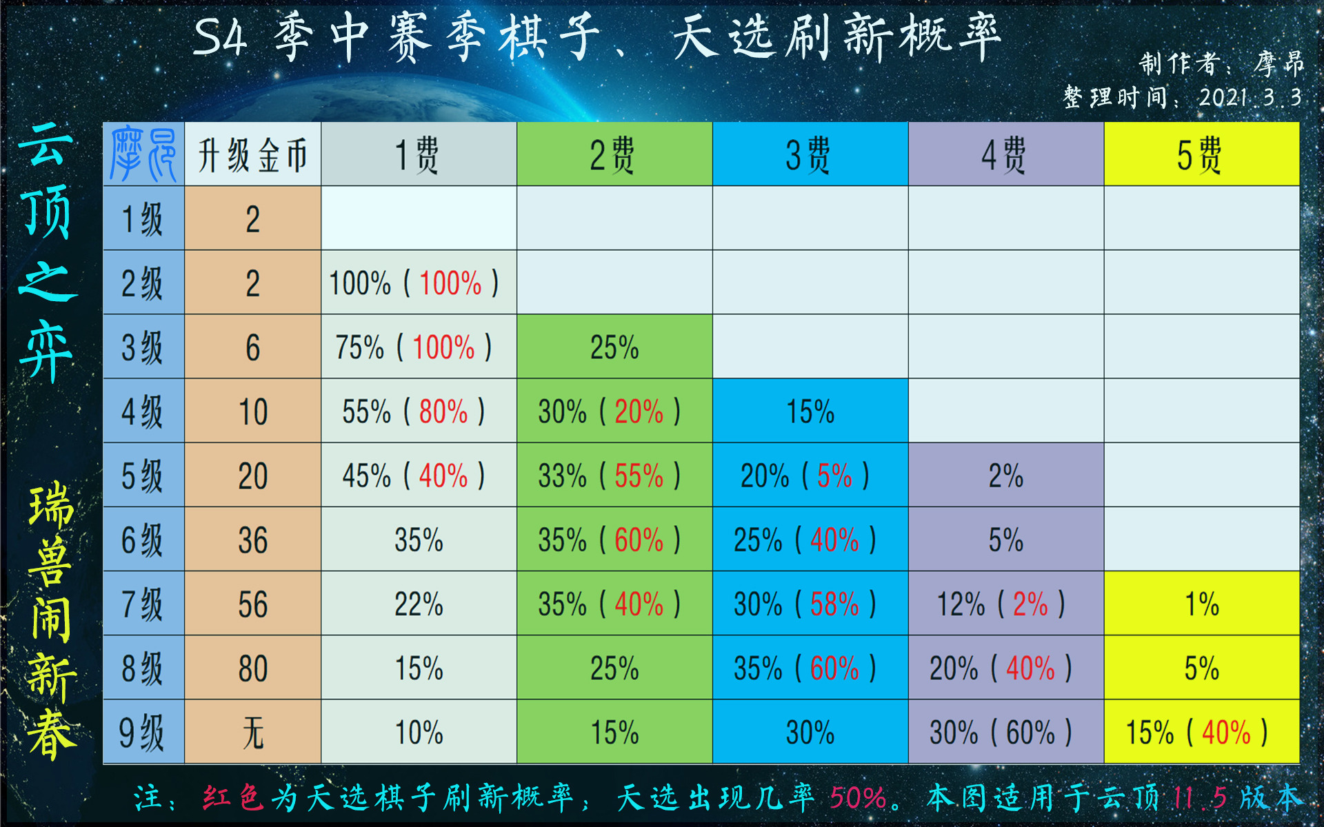 上图是摩昂整理的棋子刷新概率表。