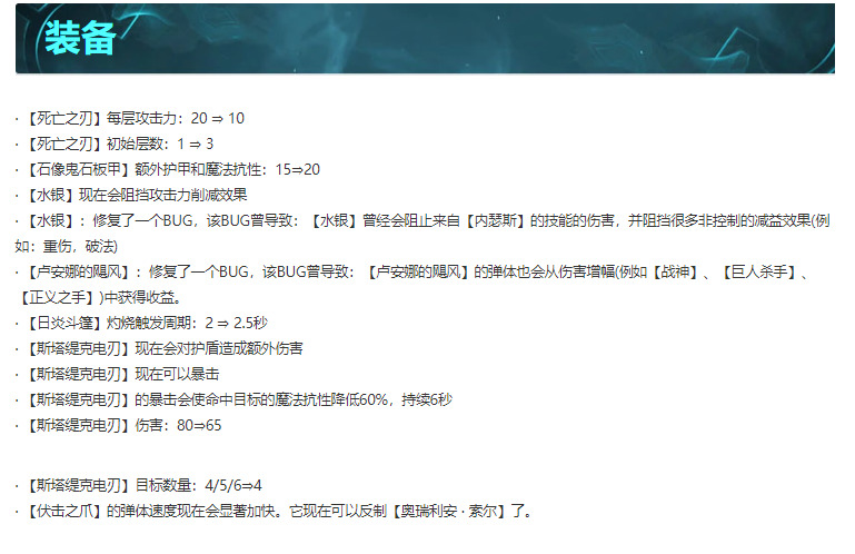 劫解读:削弱,劫初始攻速降低0.05,在明昼下,攻速下降就更高,且这把飓风的削弱,劫续航能力下降,在PBE测试赌劫,在赌狗阵容还算是属于数二的,强度依然很高。
