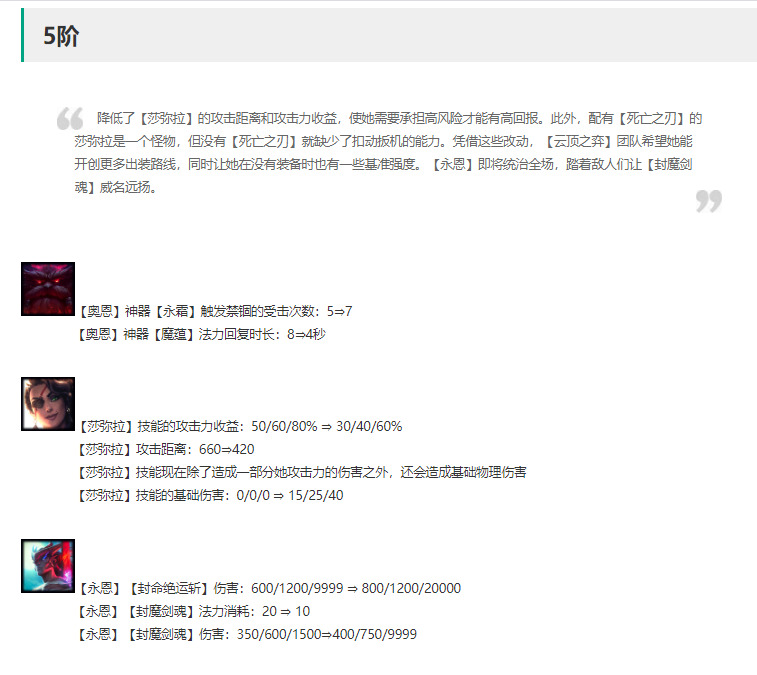 萨弥拉解读:削弱,莎弥拉的最大削弱就是攻击距离的削弱,生存能力大大降低,技能上1星携带基础伤害属于增强,2星小幅度削弱。