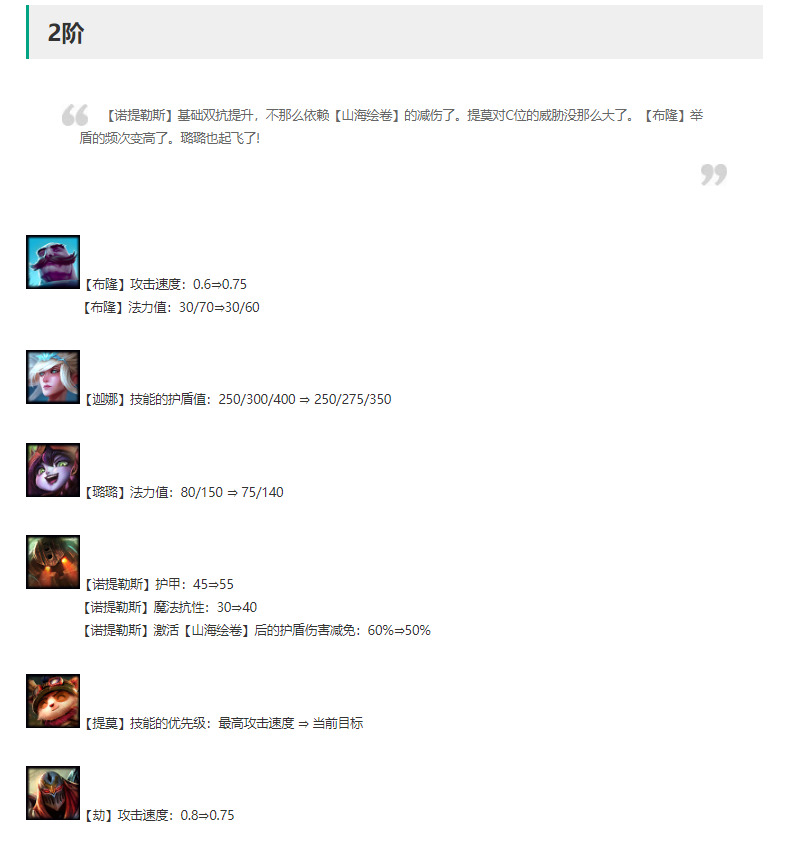 努努解读:平衡,2星努努伤害增强,3星大幅度削弱,特别是3星努努现在只有一个大棒加持下(费6森阵容),后期对局无法在出现一口一个小朋友的情况了,伤害降低,回血能力变弱。
