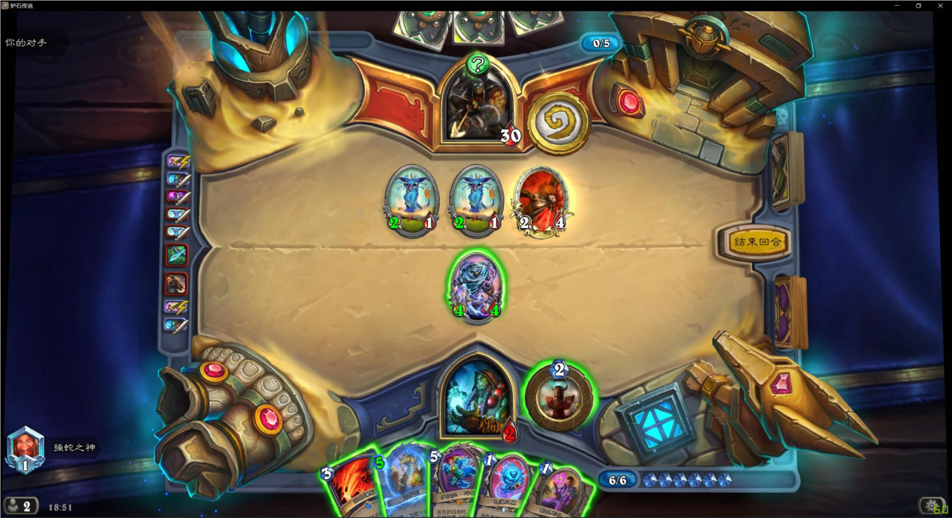 最后聊一下班德斯莫什吧。在我OB操蛇之神的诸多对局中,班德斯莫什都有亮眼表现,这与它刚刚问世时在宇宙萨中的风评比较相似。事实上标准半数以上进不了构筑的橙卡都有着及格线以上的特效,只是由于本身身材、费用等关系被其他牌比下去了而已,如果随机出来还是很强的。从构筑的角度来说,这套卡组本身没有补牌手段,经常打着打着就快没手牌了,此时班德斯莫什往往可以比较有效地过渡。而且如果你道行足够的话,还可以体验555暴龙王甚至555奥垃圾等超模一万费的单卡,在极端情况下也可以像下图所示一样扭转乾坤。