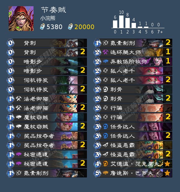构筑方面与3号日报里我的那套节奏贼有相似之处,都选择了单挂连环腿与带上异教低阶牧师,不过小浣熊并没有选择带上飞刺与艾芙瑞来稍微增加厚度,而是带上了大范来让前期节奏更加紧凑,虽然大范被削弱至了四费,但在某些对局中效果依然相当好——例如在登顶那局中小浣熊就在后手有硬币情况下2费232+暗影步造了一个8-8的范,而没有选择硬币氮素制剂造更大的范——这样会很丢自己节奏,8-8对比12-12差的不多,牧师解不掉的话都一样疼。对面牧师只能无奈313后打出GG。此外,在对阵德鲁伊时大范与飞刺虽然功效不同但殊途同归——大范是通过前期德鲁伊铺场前尽快建立场面优势来抢死对面,而飞刺则是中期德鲁伊铺场后通过返场以及断对面资源与节奏来取胜。