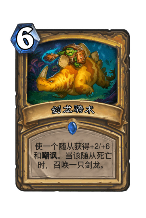 88998:使一个随从获得+2/+6和嘲讽。当该随从死亡时,召唤一只剑龙。