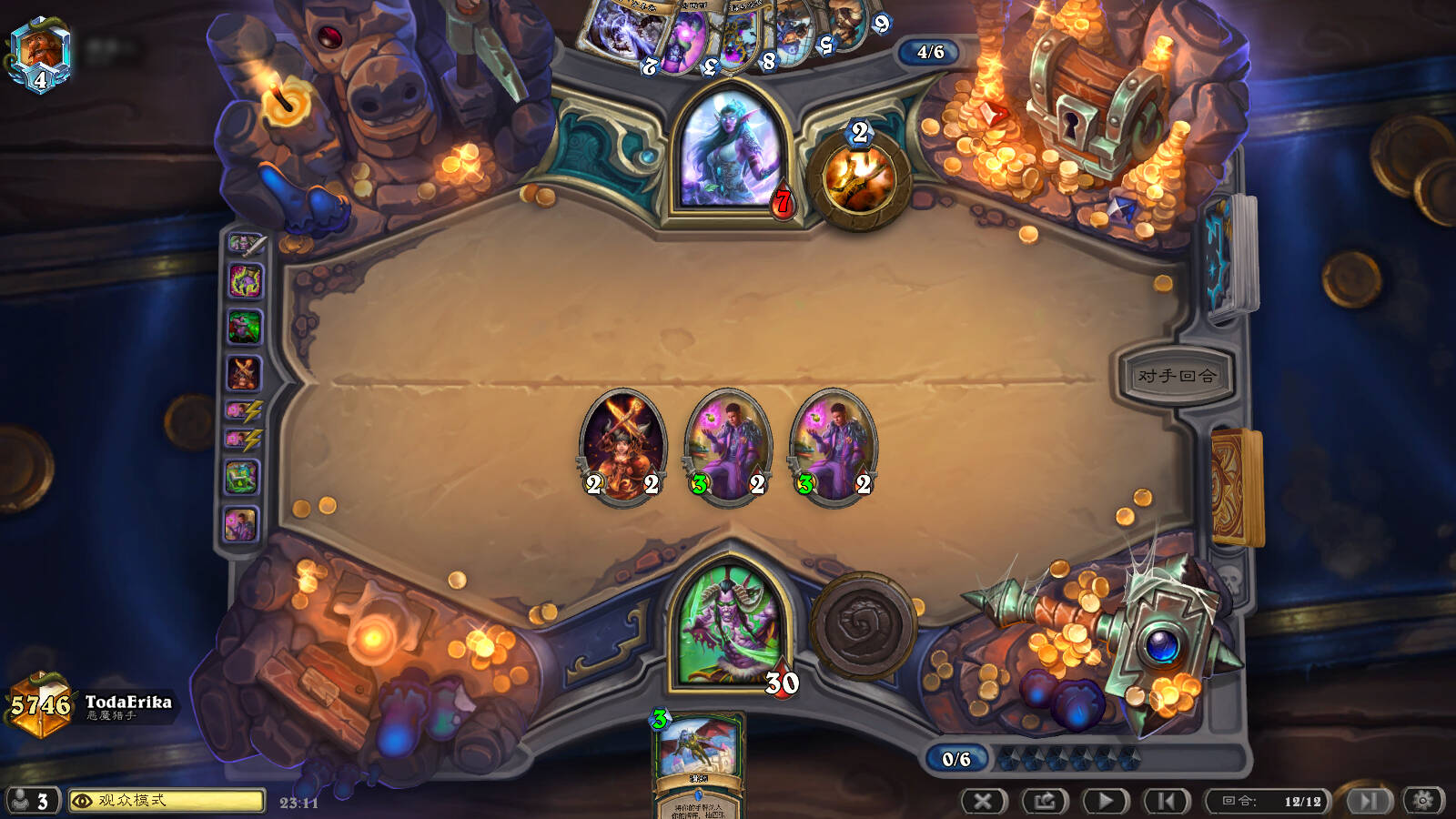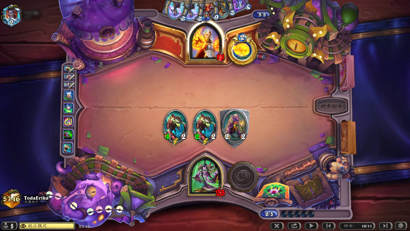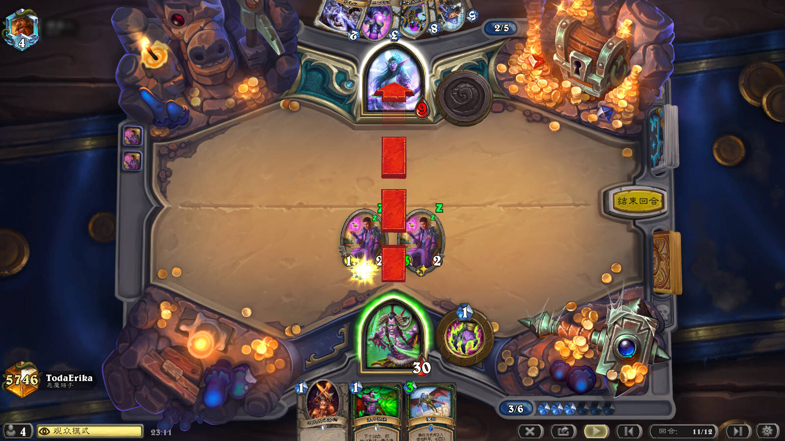 而后手有硬币的情况下,1费尽量毫不犹豫丢这个跳币再多下一个1费随从,场上站着一个3-2和一个其他的随从,给对面的压力是非常大的。
