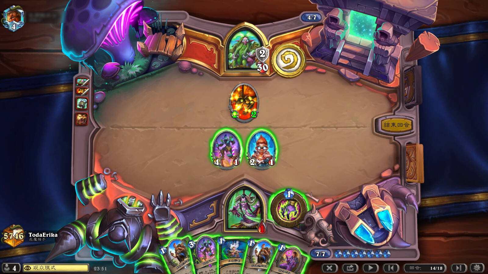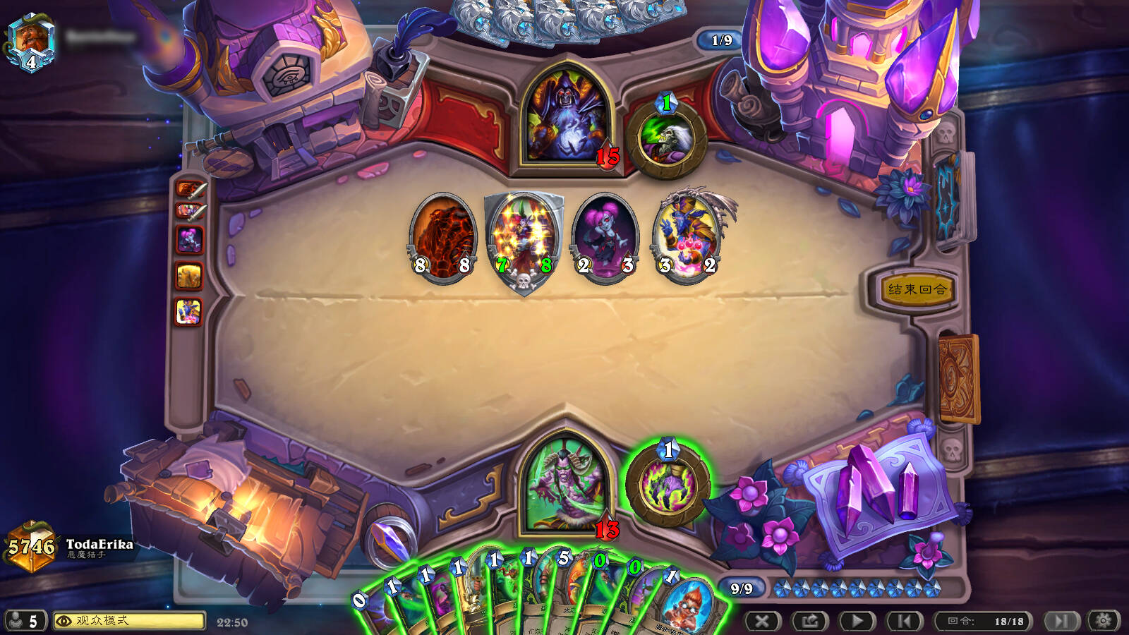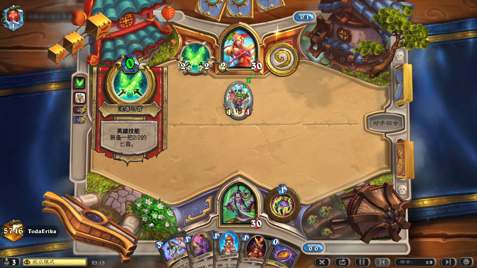而后手有硬币的情况下,1费尽量毫不犹豫丢这个跳币再多下一个1费随从,场上站着一个3-2和一个其他的随从,给对面的压力是非常大的。