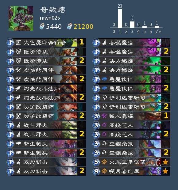 伊利达雷研习(2)、双刃斩击(2)、吞噬魔法(2)、恶魔伙伴(2)、法力燃烧(2)