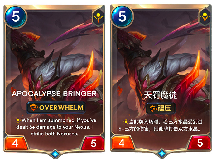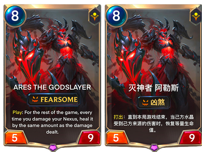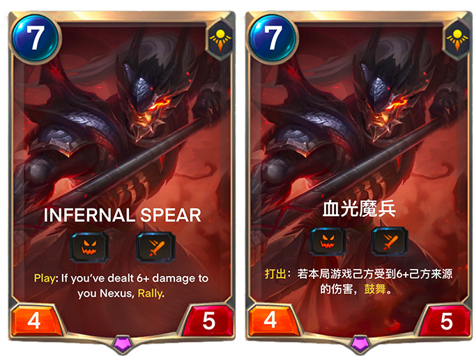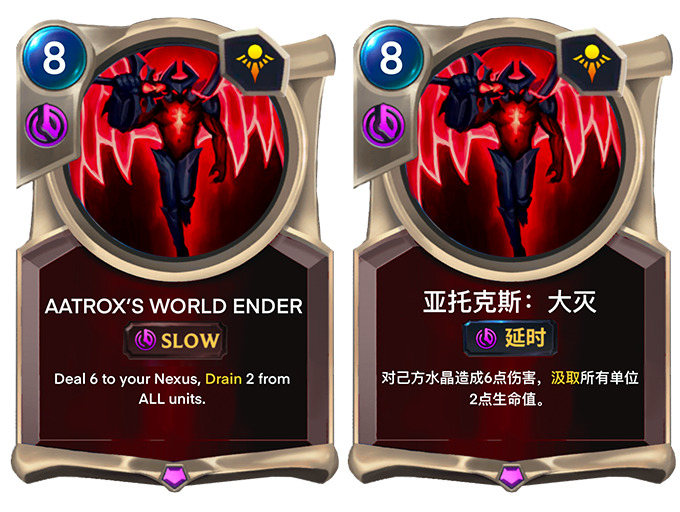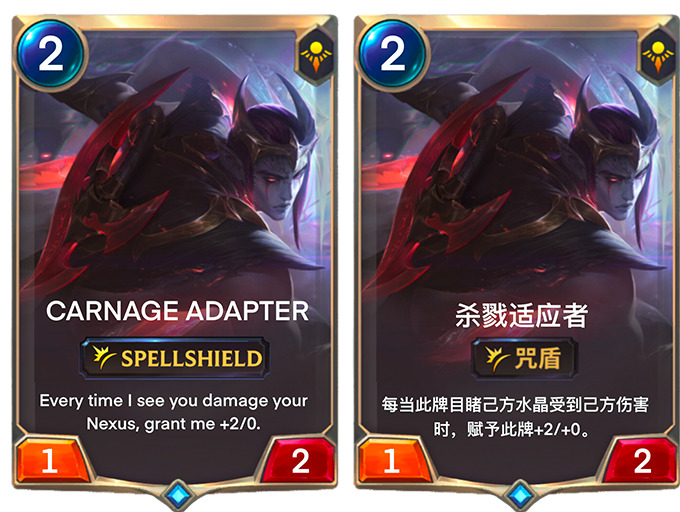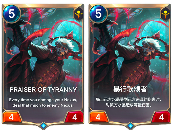 这一张算是整个体系的老大哥,不过可能实际作用并没有很大。我只是很喜欢震惧号这一类型的描述,所以想设计一个这么霸气的随从。一开始的设计是“己方水晶免疫己方来源的伤害”,但是后来觉得无法和【暴行歌颂者】配合,于是就改成现在的样子。这样的弊端就是玩家需要有更多的顾虑,而不是一味的自残换取优势。