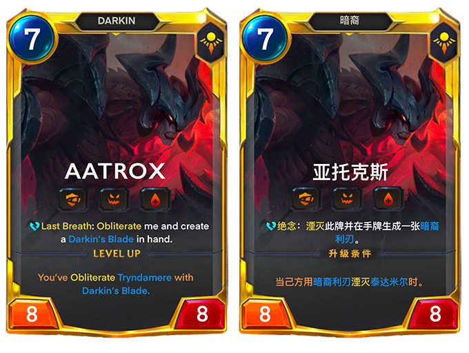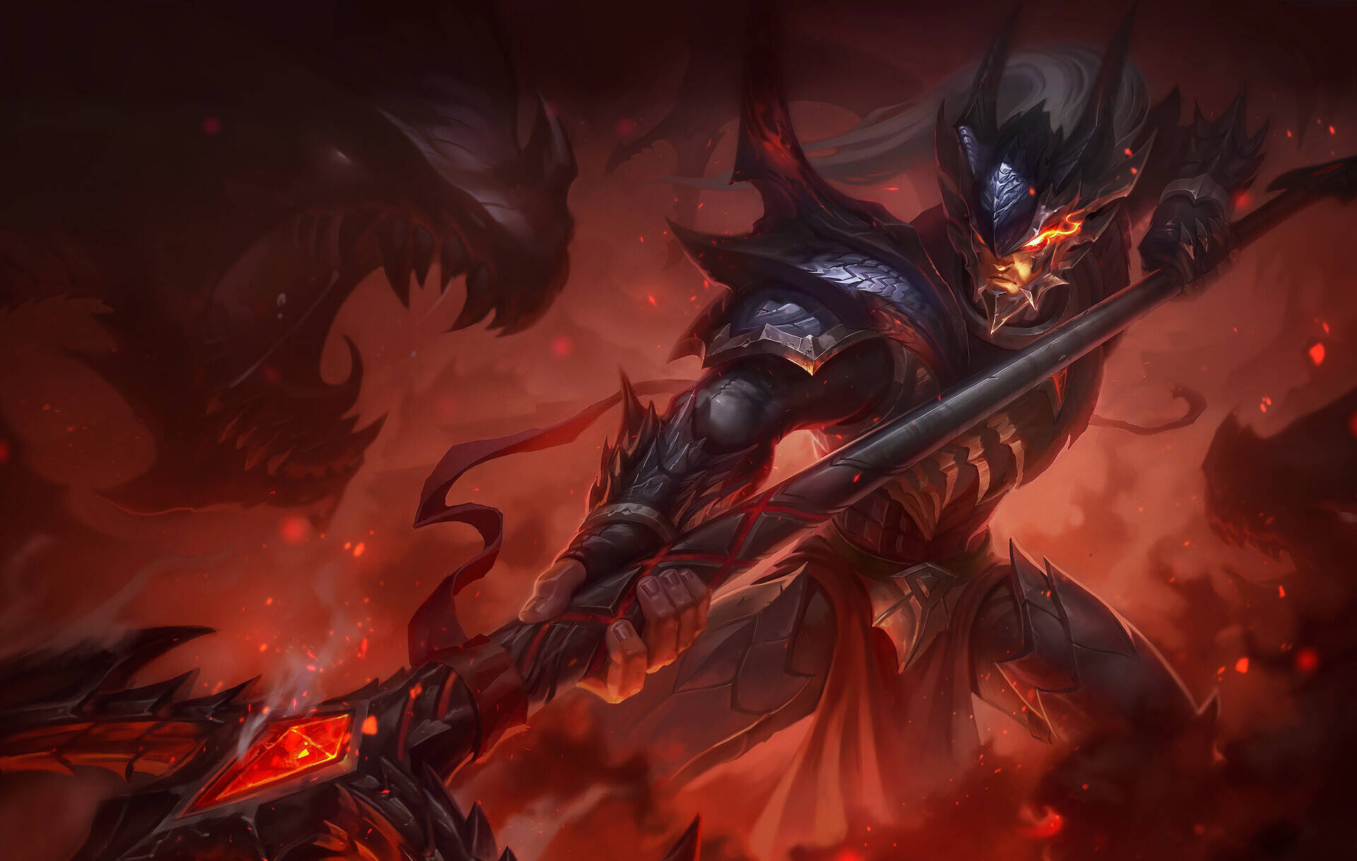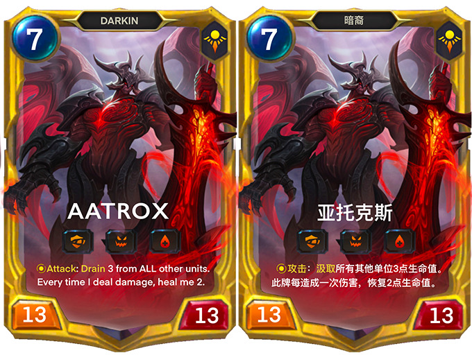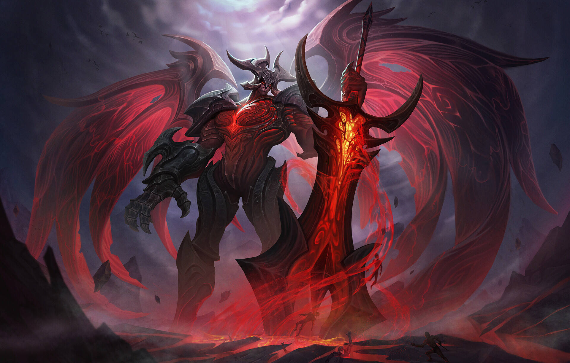 剑魔是我很早就想DIY的一个英雄,可能以前关注我的老哥看到过我设计的第一版。在恕瑞玛版本登陆后,我受到了启发,决定赋予这个堕落的飞升者升三的能力。在设计之初,我便想到了他与潘森,蛮王之间的纠葛。一开始我本想将他的升级设为“击杀潘森”,但是觉得掌控权应该在己方手里,于是放弃了这个方案。我后来想到了剑魔和蛮王的语音中,他觉得蛮王是合适的容器,便从中获得了灵感。蛮王是符文大路上数一数二的莽夫战士,而有朝一日剑魔附身上这个8费巨汉时,肯定会为符文大陆带来浩劫。和蛮王的关联使得他和弗雷尔卓的进行了很好的绑定,弗雷高恢复的特点也会很好的弥补剑魔体系的自残效果。不过剑魔并不仅限于此,他升级后强大的单体伤害也是非常超模的。不过死亡后湮灭自己的特性也使得他和暗影岛复活体系的相性不会太好,毕竟剑魔只会被封印回到他的剑里,等待着下一任宿主的到来。下面附上我使用的原图及作者。