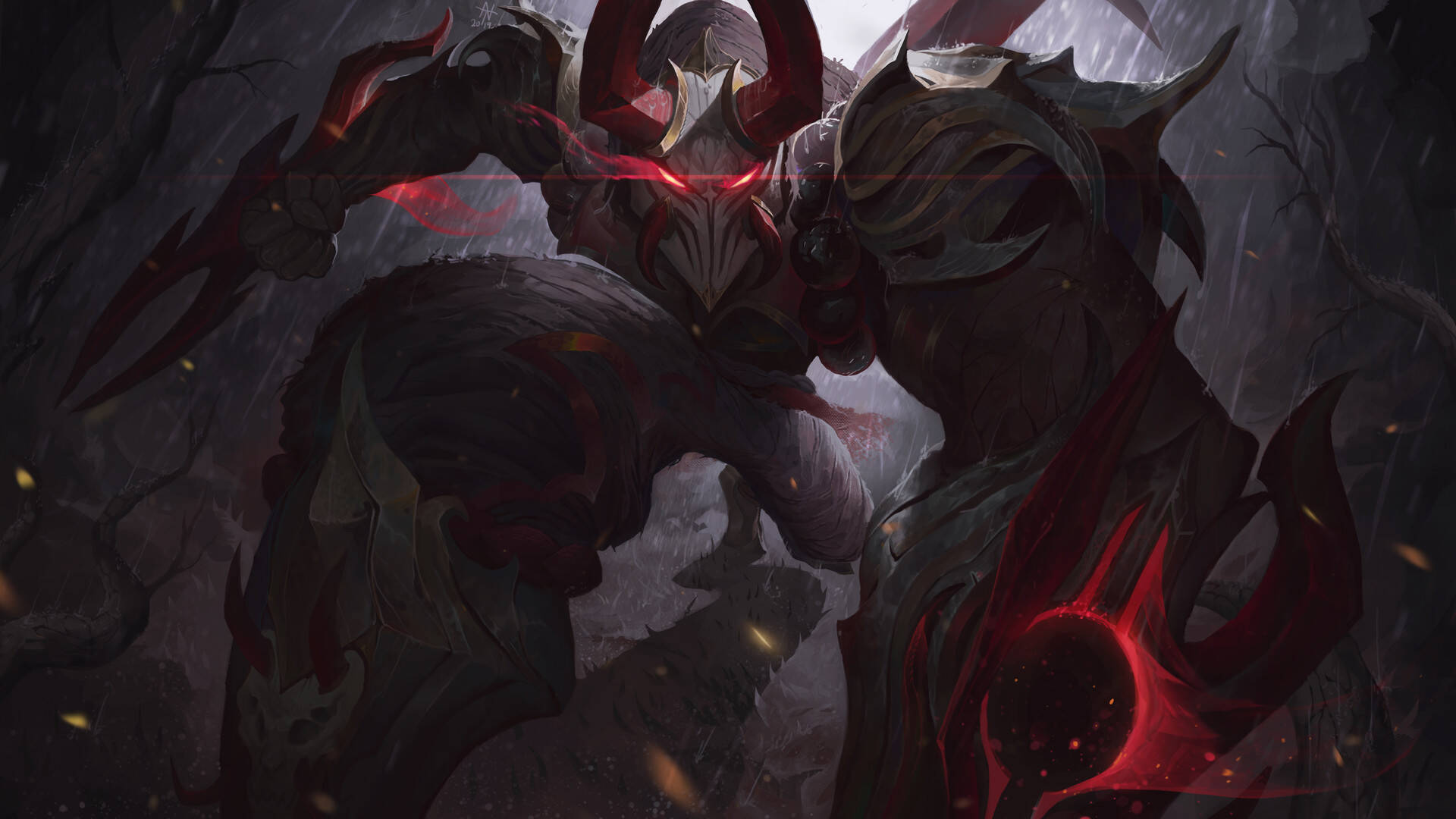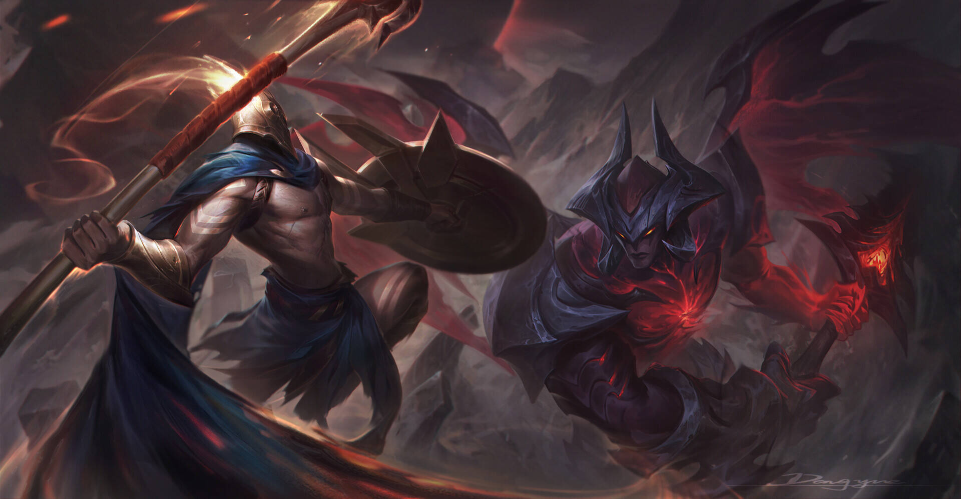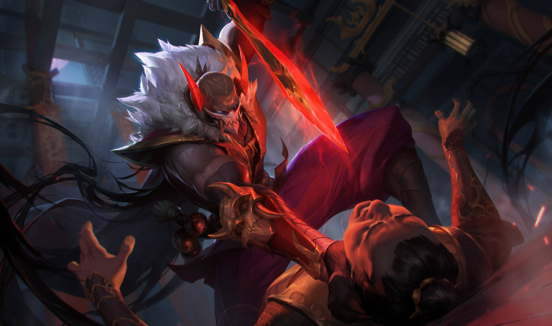 剑魔是我很早就想DIY的一个英雄,可能以前关注我的老哥看到过我设计的第一版。在恕瑞玛版本登陆后,我受到了启发,决定赋予这个堕落的飞升者升三的能力。在设计之初,我便想到了他与潘森,蛮王之间的纠葛。一开始我本想将他的升级设为“击杀潘森”,但是觉得掌控权应该在己方手里,于是放弃了这个方案。我后来想到了剑魔和蛮王的语音中,他觉得蛮王是合适的容器,便从中获得了灵感。蛮王是符文大路上数一数二的莽夫战士,而有朝一日剑魔附身上这个8费巨汉时,肯定会为符文大陆带来浩劫。和蛮王的关联使得他和弗雷尔卓的进行了很好的绑定,弗雷高恢复的特点也会很好的弥补剑魔体系的自残效果。不过剑魔并不仅限于此,他升级后强大的单体伤害也是非常超模的。不过死亡后湮灭自己的特性也使得他和暗影岛复活体系的相性不会太好,毕竟剑魔只会被封印回到他的剑里,等待着下一任宿主的到来。下面附上我使用的原图及作者。