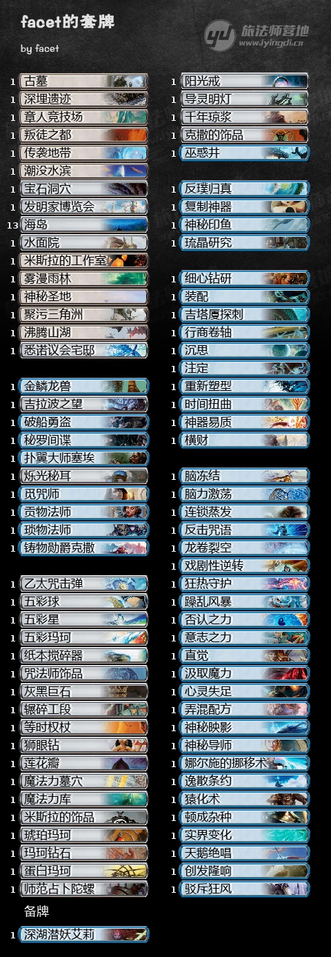艾莉是一张出色的生物(并且有漂亮的插画). 艾莉指挥官是一个基于坟场的组合技卡组, 携带少量的控制来保障自己的游戏计划, 通过时间扭曲效应(洗回牌库抓七)的循环和等时逆转获胜. 这是一个具有多层组合技的"无制胜"(winconless)卡组, 玩这套牌就像是在解谜, 如何在复杂的局面中利用大量的神器拼凑出胜利的线索是每一个艾莉牌手需要练习和掌握的.