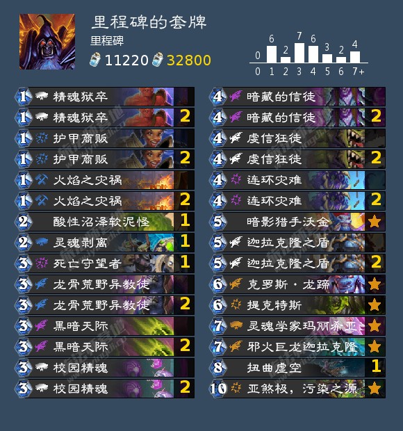灵魂剥离:这是一张很不契合慢速术士节奏的牌,因此我下了一张。术士2费时最好的节奏一定是过牌,而不是去打3。如果2费就急着打3解场,3费难道要继续解场吗?如果一直解场不过牌,术士的手牌资源很快就会跟不上。2费显然是最好的过牌时机,只要3费用黑暗天际或者校园精魂清场就可以了。也正因此,我一般不会在起手留下这张牌。当然,术士确实缺少2费牌在中期填补曲线,比如6费7费的回合有打3配合暗藏的信徒或迦拉克隆之盾就非常不错,带满也没有问题。