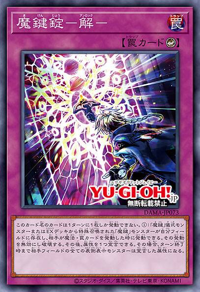 ①:「魔键」仪式怪兽或者从额外卡组特殊召唤的「魔键」怪兽在自己场上存在,对手将魔法·陷阱卡发动时才能发动。那个发动无效并破坏。那之后,可以宣言1个属性。那个场合,直到回合结束时对手场上的全部的表侧表示怪兽变为宣言的属性。