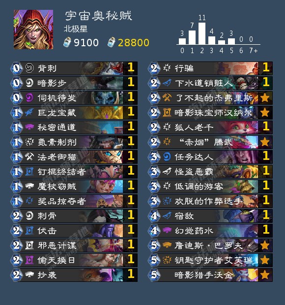 盗贼在这个版本其实有两个比较大的优势,资源(卡差优势)和节奏(费用优势)。奥秘和JK体系偏向资源,而连击和潜行体系偏向节奏,再加上强势的过牌(通道)和一些假卡(马上要被削弱的小刀油),整体还是比较强势的。而宇宙贼的思路其实很早就有,主要是围绕着JK国王两张卡,可以打出非常高的value,然后有姐夫讲故事。但是在这个版本,JK被削弱后的节奏已经跟不太上竞速赛的速度了(回调之后的表现可以期待一下),但是姐夫暗影步仍然是非常诱人。再加上通灵版本的整体最高3费的宿敌奥秘贼展现出的衍生资源可以说是足够打很多后期卡组了,所以我就想:可不可以压低宇宙贼的曲线,牺牲一部分大多数时候用不上的厚度(其实JK体系的玩家应该会发现在这个版本基本没时间摇跟班了),补强前期的节奏呢?再加上在这个卡池最深的版本优质卡实在是太多,所以这套曲线最高5费的低费宇宙奥秘贼就成型了。