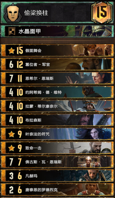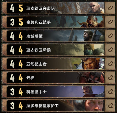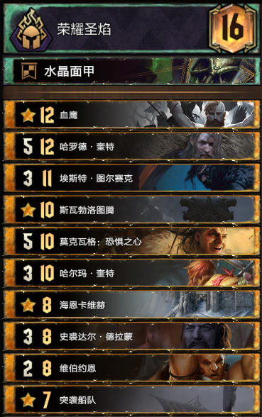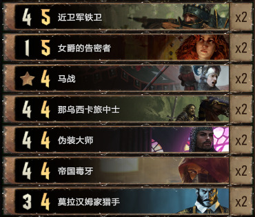 卡组中规中矩,主要说一下新卡恩希尔·恩瑞斯。其实大帝只要拉回来两个1点间谍就已经不亏了,而且1点间谍不限于我们的女爵告密者,我们可以修对面单位成1点,佛古斯恩瑞斯标记成间谍抓回来(抓一个就是两点),同时血剑之后的约阿西姆也是1点会直接被抓,所以玩着套牌需要时刻主要格子,不要自己被塞满了放不下单位导致输掉对局。