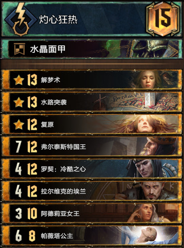 辛迪加的表现同样亮眼,依靠砍刀和钻车还有大量引擎能打出很恐怖的点数。环境里松鼠我主要遇到的还是各种陷阱卡组。北方的猎魔人卡组表现不佳,但是妹控突击队和褐旗营铺场卡组的表现还不错,福尔泰斯特相当的好用,就是大部分情况只能复制一个东西然后就被解了。帝国的卡组花样繁多,纯间谍、混合、传送门间谍同化、老实人剧情、剧情抓各种各样的卡组都有,但是到底哪个最适合环境还没有一个清晰的结论。怪兽的卡组主要以吸血鬼为主,还混杂着奇奇怪怪的蟹蜘蛛和前朝余孽红龙。