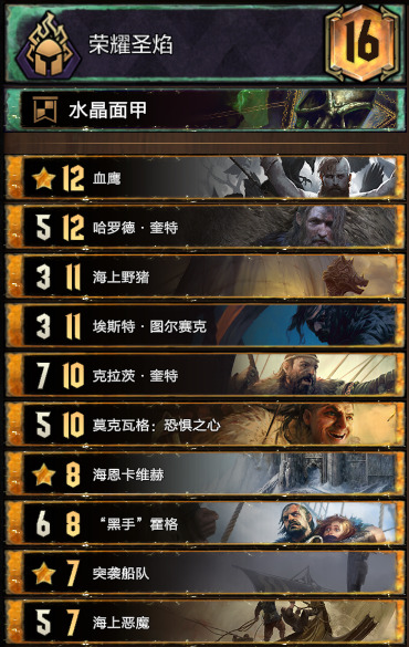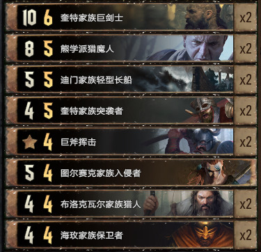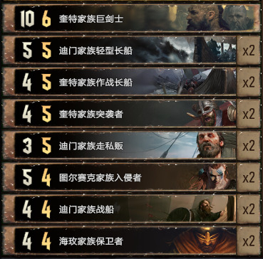 黑手霍格的表现也很好,既能保护船只又能配合水手修点,站住之后点数很大。整套卡组里最出彩的卡就是:图尔塞克家族入侵者和奎特家族突袭者。这两张卡都是双词条卡,既有水手词条也有战士词条,可以让这套卡组带上哈罗德·奎特来提升短局的节奏。艾斯特·图尔塞克是群岛必带卡我就不多说了,带了一张巨剑配合领袖,如果脸黑的话可以考虑多带一张(但是我就算巨剑上手了也可以直接用艾斯特扔了,然后领袖扔一个7点的图尔塞克家族入侵者)。