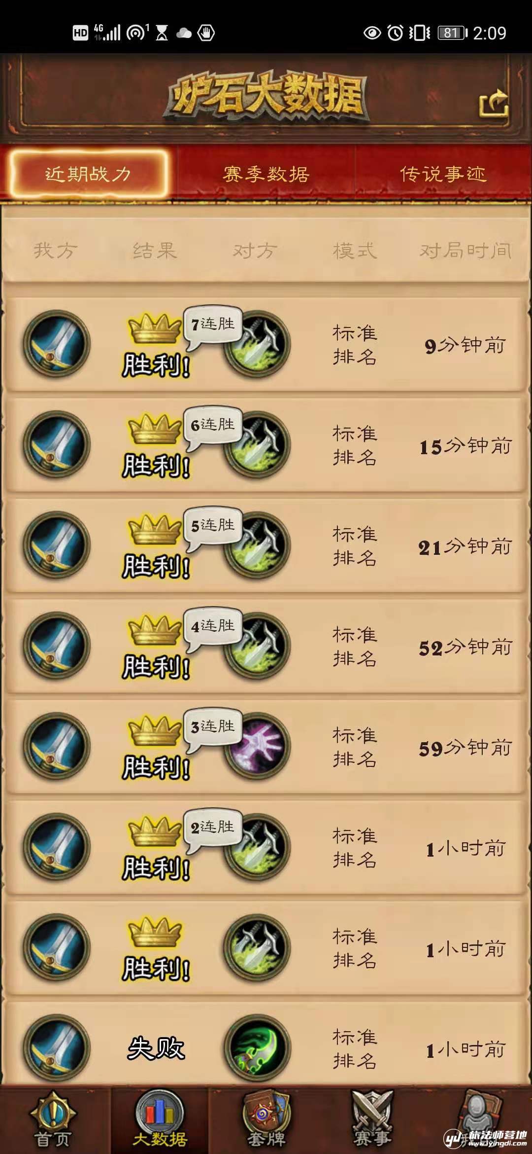 (实时排名、近期对战以及卡组胜率截图)