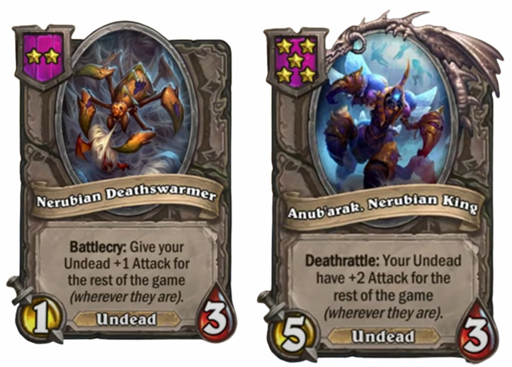 两个亡灵蛛魔Nerubian Deadthswarmer和Anub'arak, Nerubian King的加攻buff是光环效果,作用于手牌、战场、发现衍生物、战斗阶段衍生物、酒馆等所有目标。