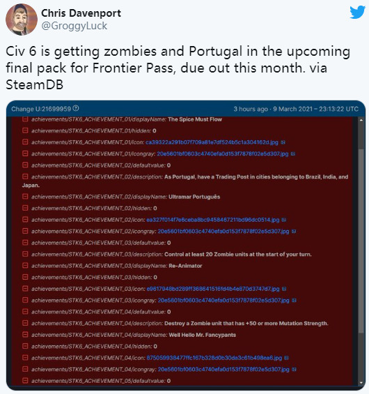 《文明6》新纪元季票的大部分内容已推出,目前还剩一个DLC未公布。近日据外媒Gamerant报道,这款将于3月发布的DLC将追加僵尸模式,以及新文明葡萄牙。该信息来自SteamDB,有玩家在SteamDB上发现Firaxis在游戏中置入了新成就。