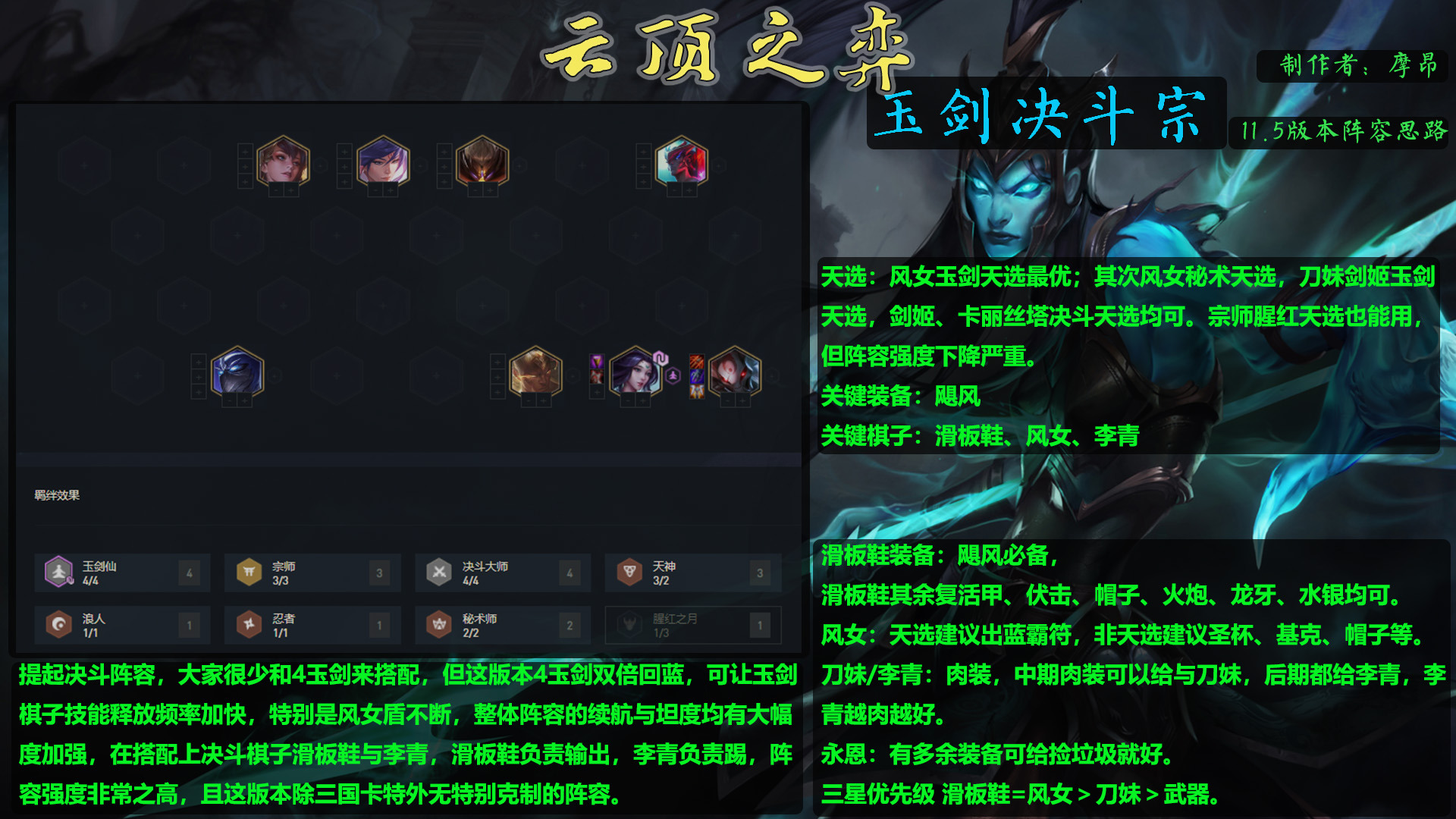 云顶11.5版本更新后,真的太爽了,摩昂觉得这版本是比较平衡的版本很多阵容都是可以玩的,运营的版本就是舒服。昨天给大家带来了一篇视频叠最强的盾与矛,玉剑决斗宗,无脑吃分,很多朋友上了大分,但有些朋友还是对阵容不太理解,今天摩昂就详细与大家探讨下。