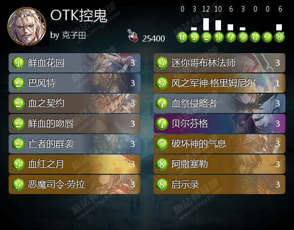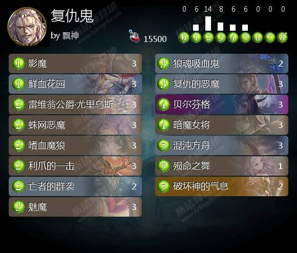 诸神包中,上文中提到的巴风特也是对吸血鬼本身的另一种可能性拓展,结合血月、贝姐以及同一卡包出现的疫病假面,很容易让人联想到控制倾向的吸血鬼思路,但当时的版本节奏由于直伤和场面压力等等原因,上下浮动血线的,纯粹依靠复仇控制的思路已经不适应版本了,于是控鬼出现了两条全新的分支,一种是通过携带大量中立组件,诸如巴哈姆特与撒旦,以及本家的妖艳的吸血鬼等组件继续进行长期控制的思路展开,另一种则开始寻求通过OTK达成刹车片般限速的手段。