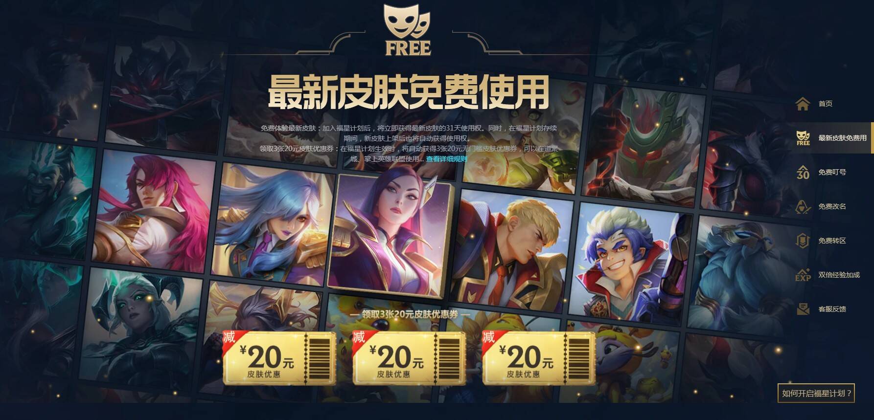 在加入福星计划时,召唤师获得免费使用的新皮肤,以当时页面展示皮肤池为准。