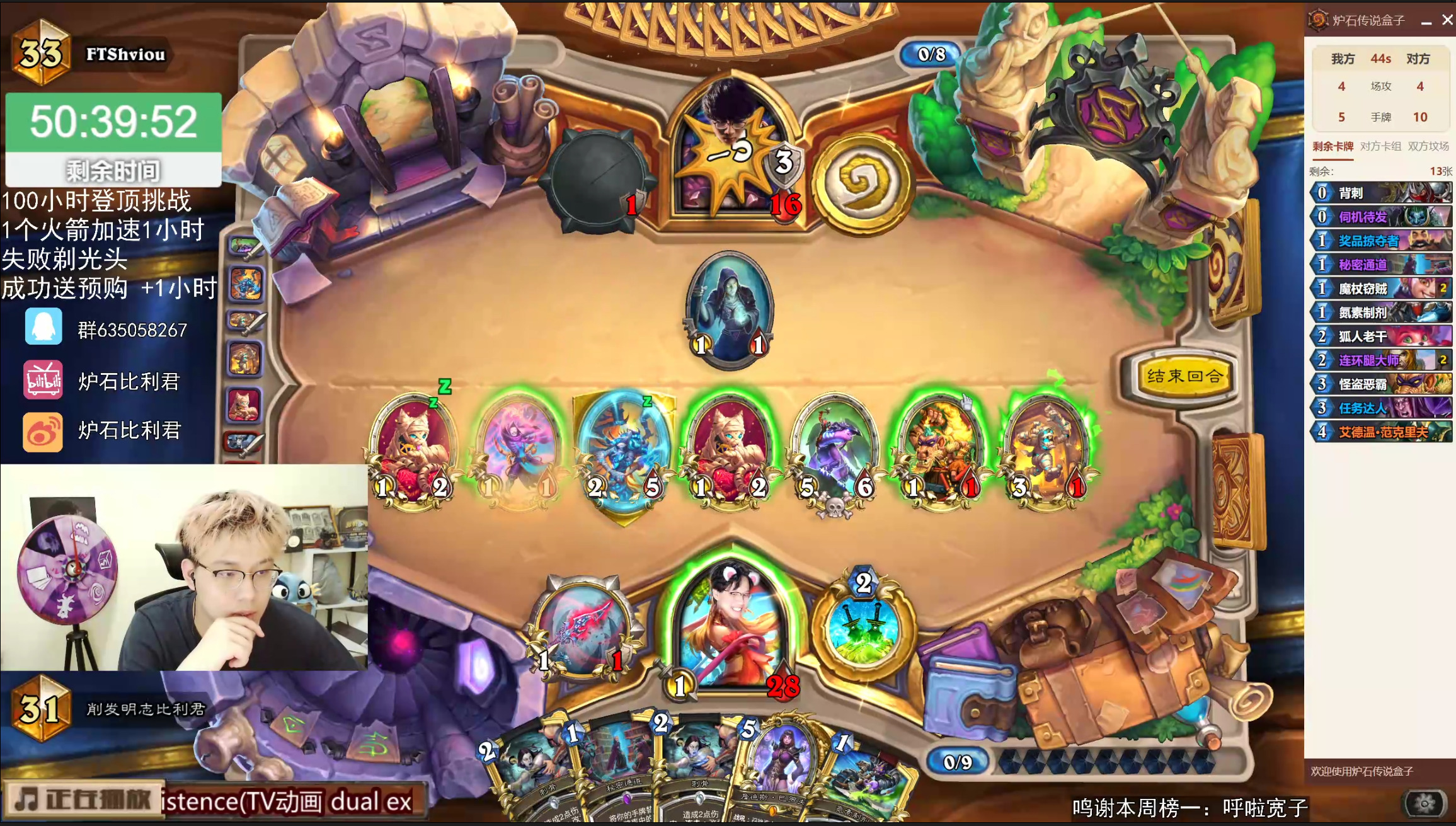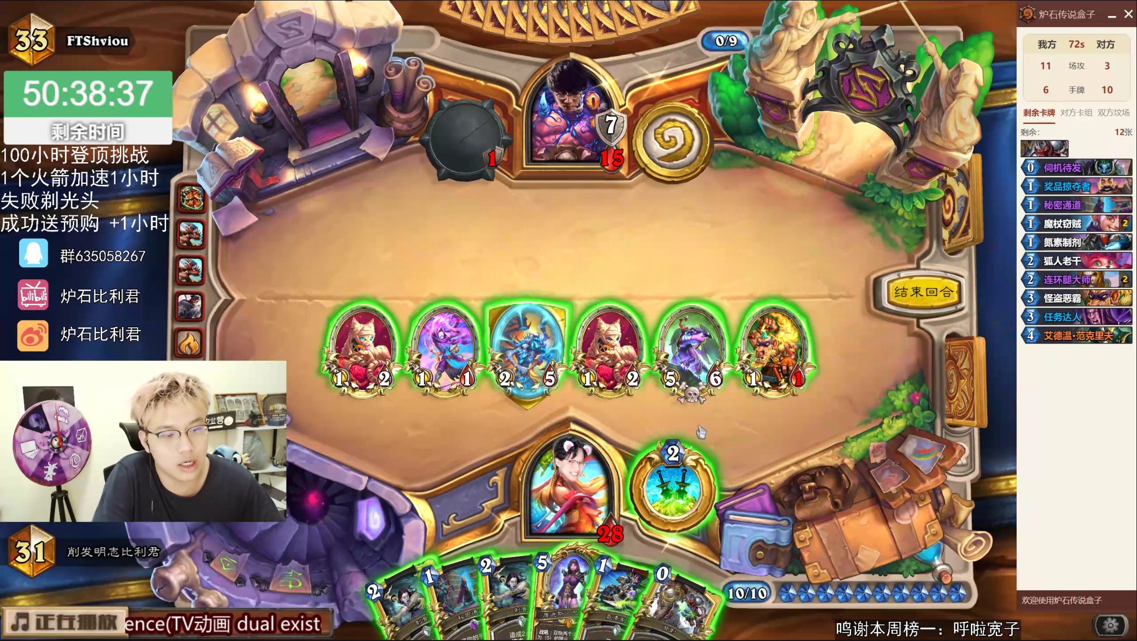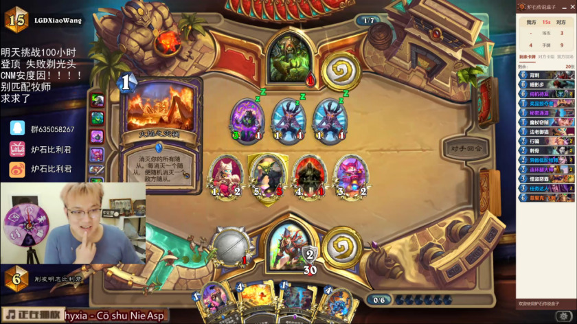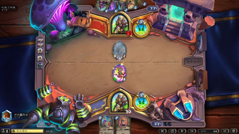 这个对局和正常快攻卡组差不多,战吼萨大概在6费左右做完任务。需要提防一下沙暴元素,注意站位防鱼斯拉。后手任务达人优先级在这分对局也没那么大,现在战吼萨会带衰变飞弹。