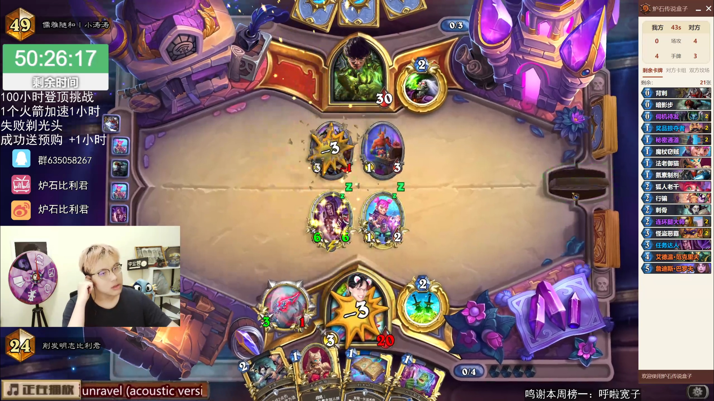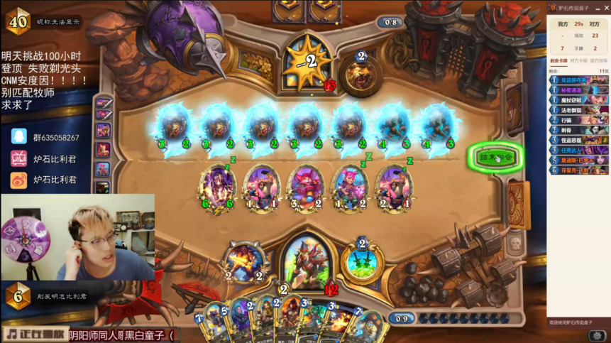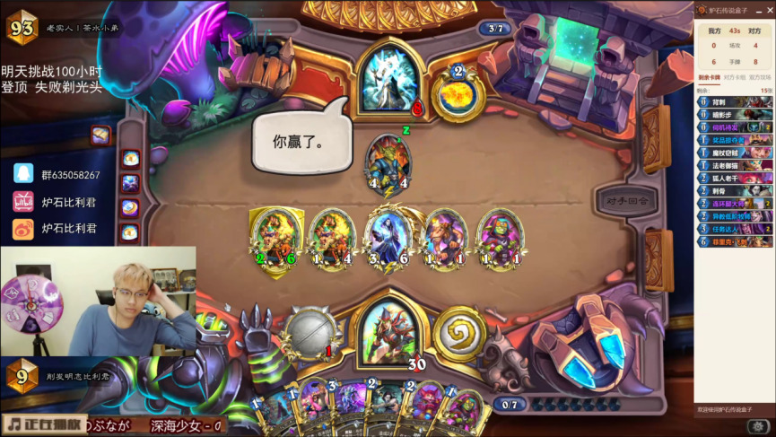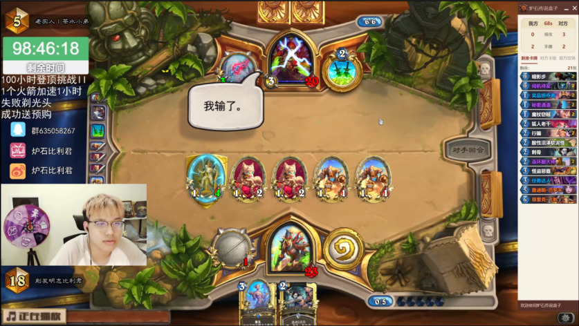 (最后被我屯的直伤无情斩杀。如果当时保了3/1的怪,对手就很有可能交艇长了。记对面伤害牌很重要,有时候诱导打法有奇效,例如氮素制剂指对面随从装背刺刺骨可以加大对手记牌难度。)