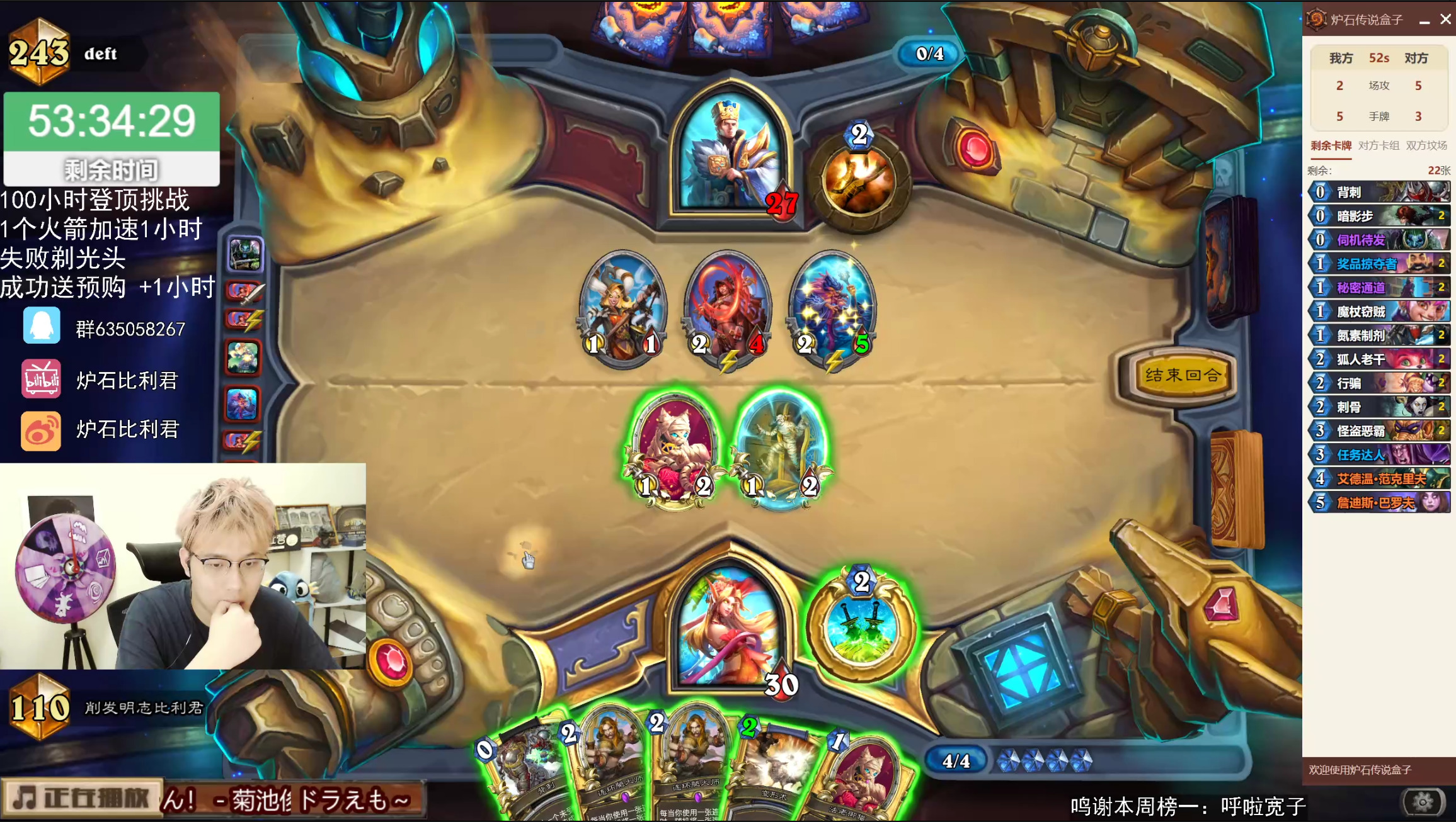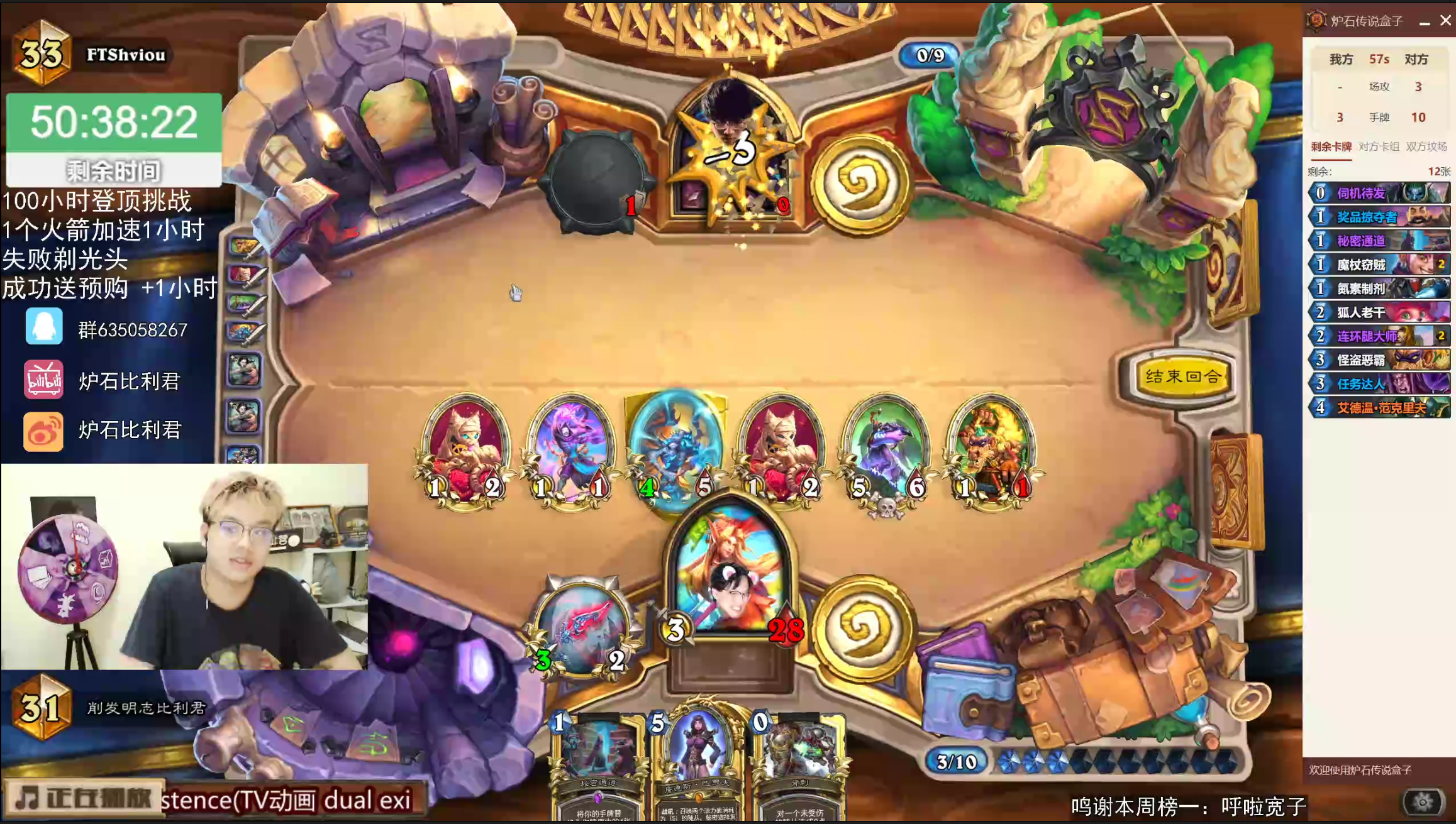 这里讲几个核心要点:后手二费硬币打了有节奏,能起跳就起跳,不要贪任务达人。留着容易被先手牧师313换牌把手里背刺暗影步通道全打掉,这种情况就直接输了。