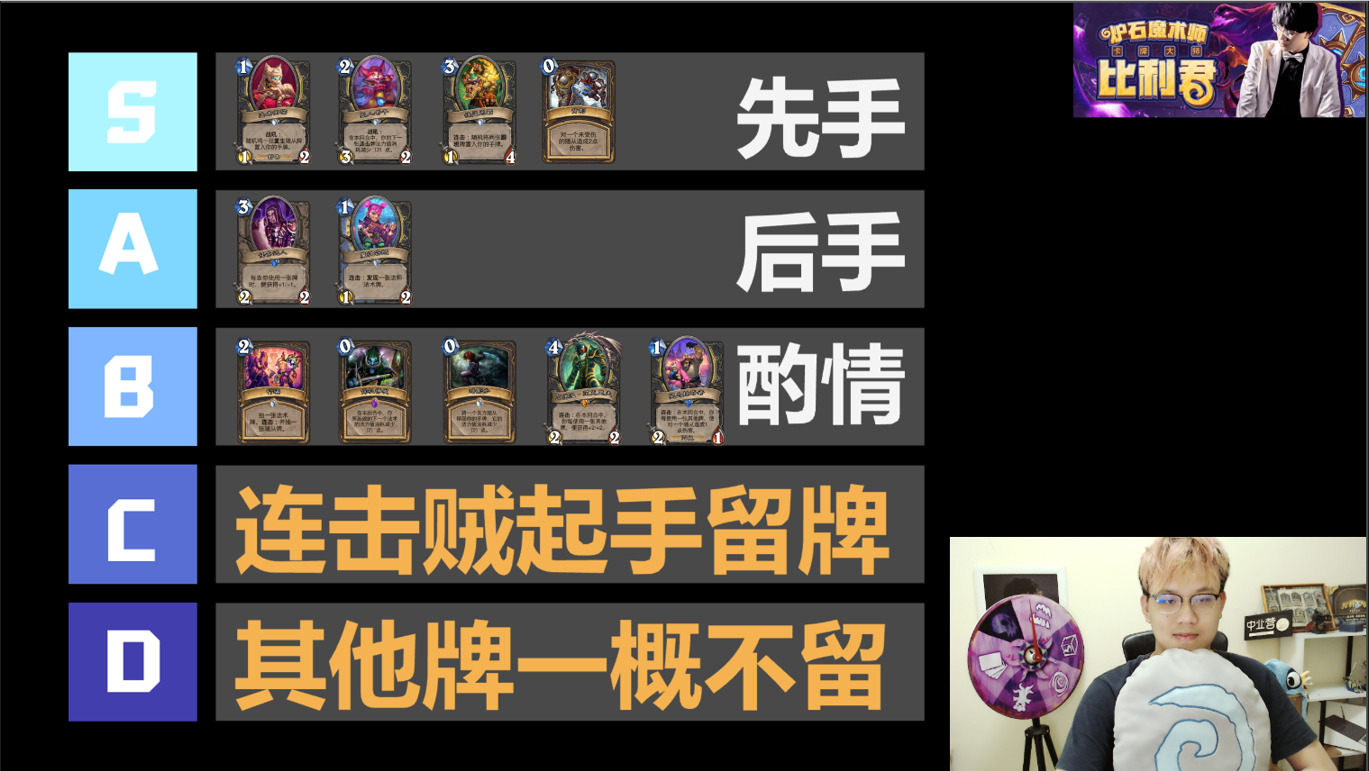 T3【酌情留下】:行骗(和狐人老千或伺机待发一起出现时留,或后手打牧师战士等慢速职业留),伺机待发(和任务达人或行骗一起出现时留),暗影步(后手和任务达人一起出现),范克里夫(和狐人老千、暗影步一起出现时才留),奖品掠夺者(后手打黑眼术、盗贼、萨满、法术德等铺场卡组时留)