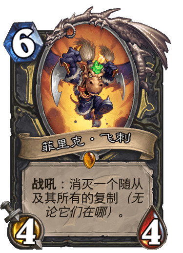 飞刺这张牌属于环境卡。在面对吸血瞎这个劣势对局时能凭借一卡之势扭转战局。我经常会用女巴&任务达人抢血,诱导对面交出莫尔葛工匠进行回血和解场,然后用飞刺破坏掉对面的OTK组建获胜。而且飞刺作为一张优质单解是不亏属性的,打圣骑士和德鲁伊时表现也良好。