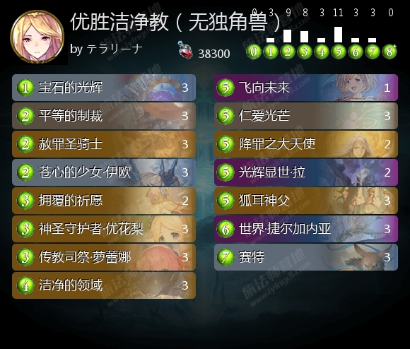 在3月10日的比赛里出现了一套不携带咏唱:独角兽祭坛的洁净教并取得优胜。这套卡组的使用者テラリーナ是洁净教的真爱粉,在2月末就用洁净教取得了一次JCG优胜,应该说不携带独角兽祭坛是有理由的。