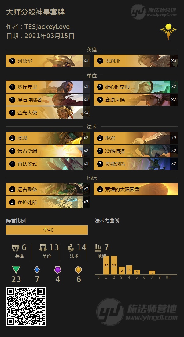 前几天上了大师,略感无聊,想着恕瑞玛神皇牌组到底能不能在大师分段玩,遂组了一套岩雀沙皇,经过几次修改,强度还可以,对阵各种对局都有一站之力,在大师分段冲到100多分, 不过后来降了下来最后68分收尾,全程在大师分段打,赢了20多盘,输了10盘多点。
