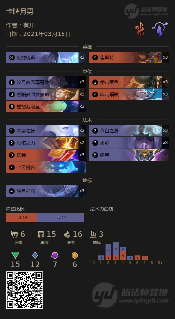 卡牌月男:这是有川的三套牌里相对来说快攻抗性最差的一套,但也是最万金油的一套,只要不过分脸黑,无论是3费月男拉章鱼返场,还是4费卡牌切红牌清场,二者有其一,绝大多数快攻便很难东山再起,面对中速时有月男的坠明拖回合,面对控制时有神殿保护下的双英雄升级,上个版本的答案之一在月男被削去一血后依旧坚挺,因为全面,所以强大。