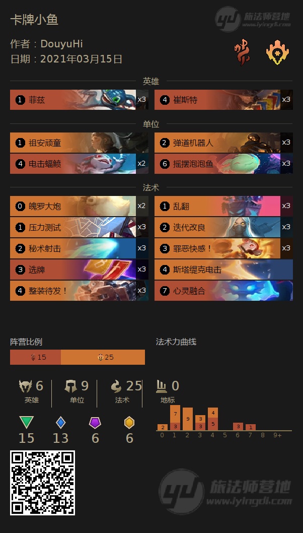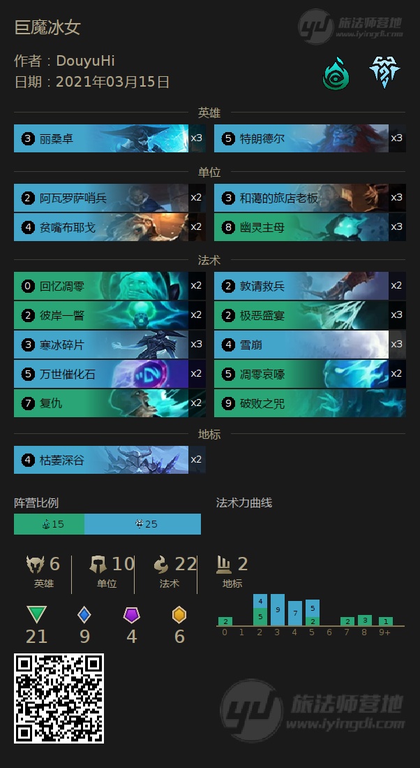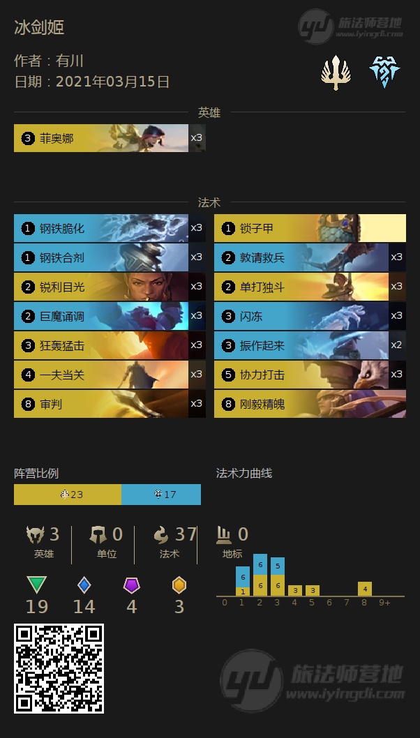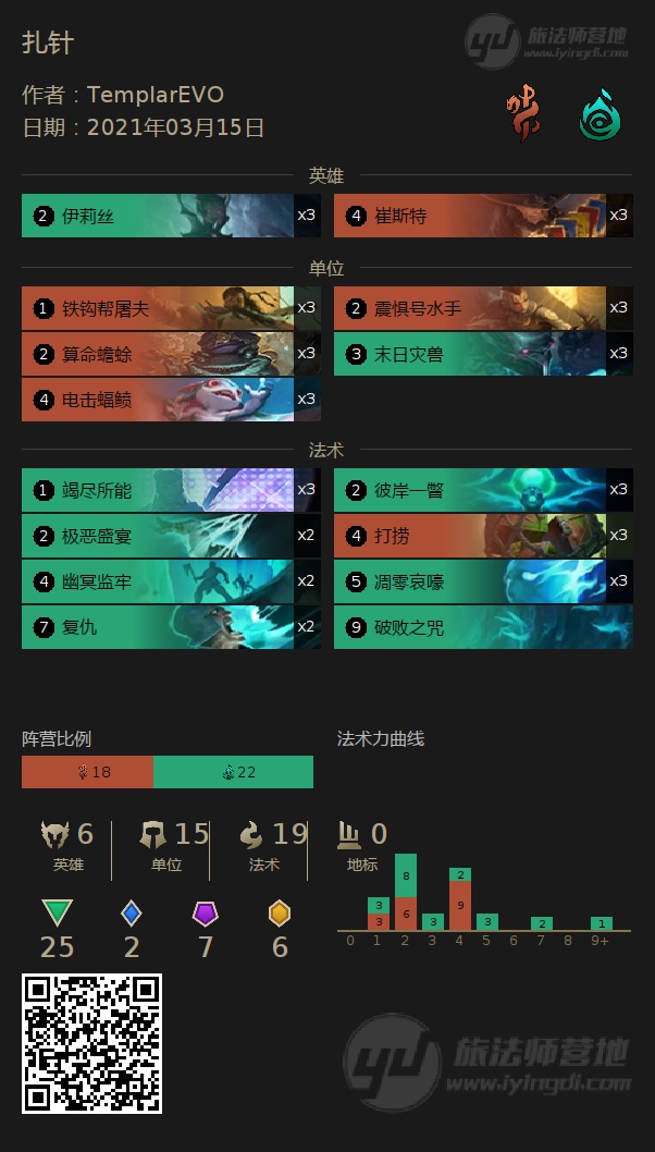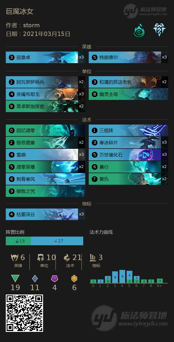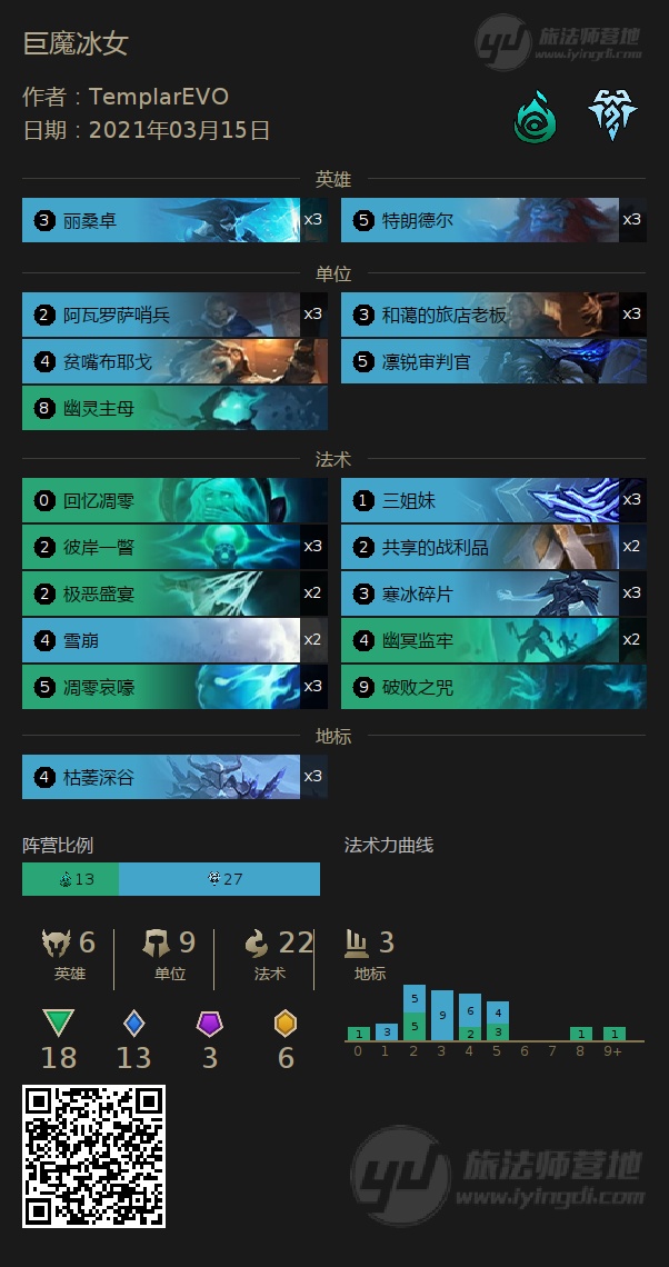 巨魔冰女:Templar的巨魔冰女构筑同样很有趣,没有采用大量找英雄和主母、利用守望者获胜的思路,而是选择了一个多核打法,一张审判官可以在7、8费回合突然提速,打对面一个措手不及;2张共享战利品在过牌的同时能buff到生物,在中期的生物交换上更具优势;3张三姐妹十分灵活,既可以在面对内战或盲僧时拖回合,又可以在后期局面僵持之际冷不丁利用巨魔和88碾压斩杀,这种灵活的卡位取舍值得每一位愿意尝试构筑的玩家去学习。