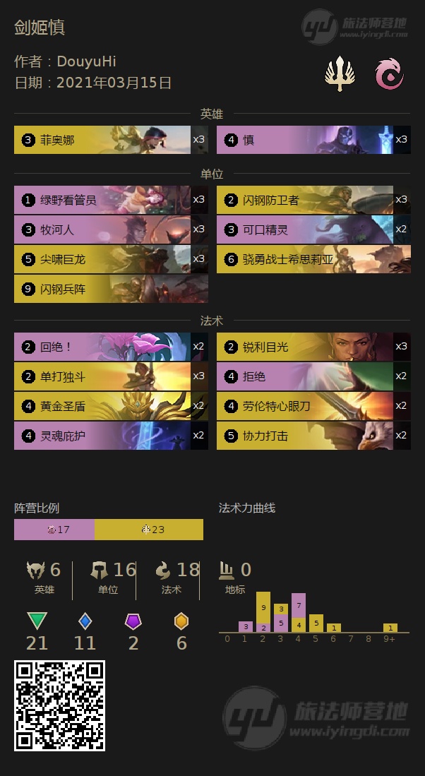 剑姬慎:自从慎被加强到3/5后,这套牌就成为了比赛的万年常青树,进可铺频率抢死巨神峰和暗影岛控制,退可利用剑姬和吸血盾抵御各种快攻,嗨哥的版本加入了两张可口精灵,进一步增强抗快属性的同时利用高达4点的攻击抢控制套的血,不可谓不绝妙,节奏好的剑姬慎神挡杀神佛挡杀佛,只怕一手发牌员。