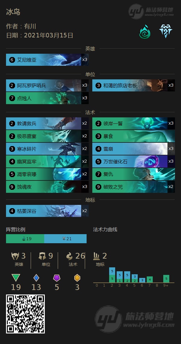 冰鸟:自lor开服以来,冰鸟一直是比赛的常客,虽然在巨神峰的巅峰时期曾一度隐身(8费湮灭永远的神),但随着巨神峰大量单卡的削弱,到了Ace杯举办之时,大家已经用热情一把火,燃烧了整片恕瑞玛沙漠,虽偶有巨神峰登场,却很少见到祈愿;除此之外,过去冰鸟的另一个克星便是身材扎实的中速套(女枪奎因、碾压等),但新版本小凋零(寒冰碎片)、大雪崩(枯萎深谷)的加入,让原本快攻抗性拉满的冰鸟面对中速时也不再畏惧。