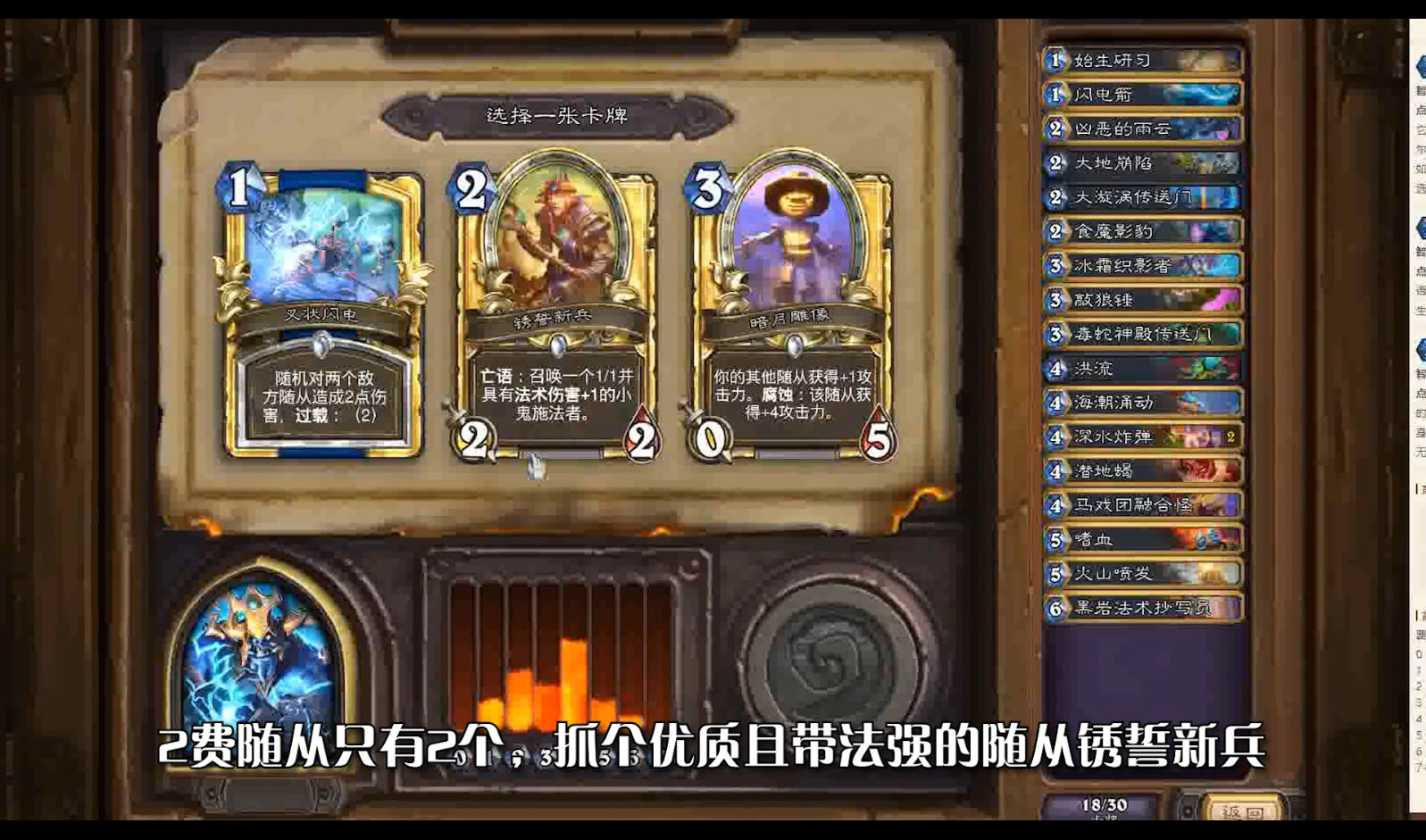 2费随从只有2个,抓个优质且带法强的随从锈誓新兵。当然这里雕像也不错的,如果2费随从再多点我就考虑345。雕像对于萨满来说可能比骑士更重要,因为可以把图腾质变成有攻击。不过快攻卡组还是优先考虑节奏,先追求好按费拍怪,摇图腾太让节奏了。