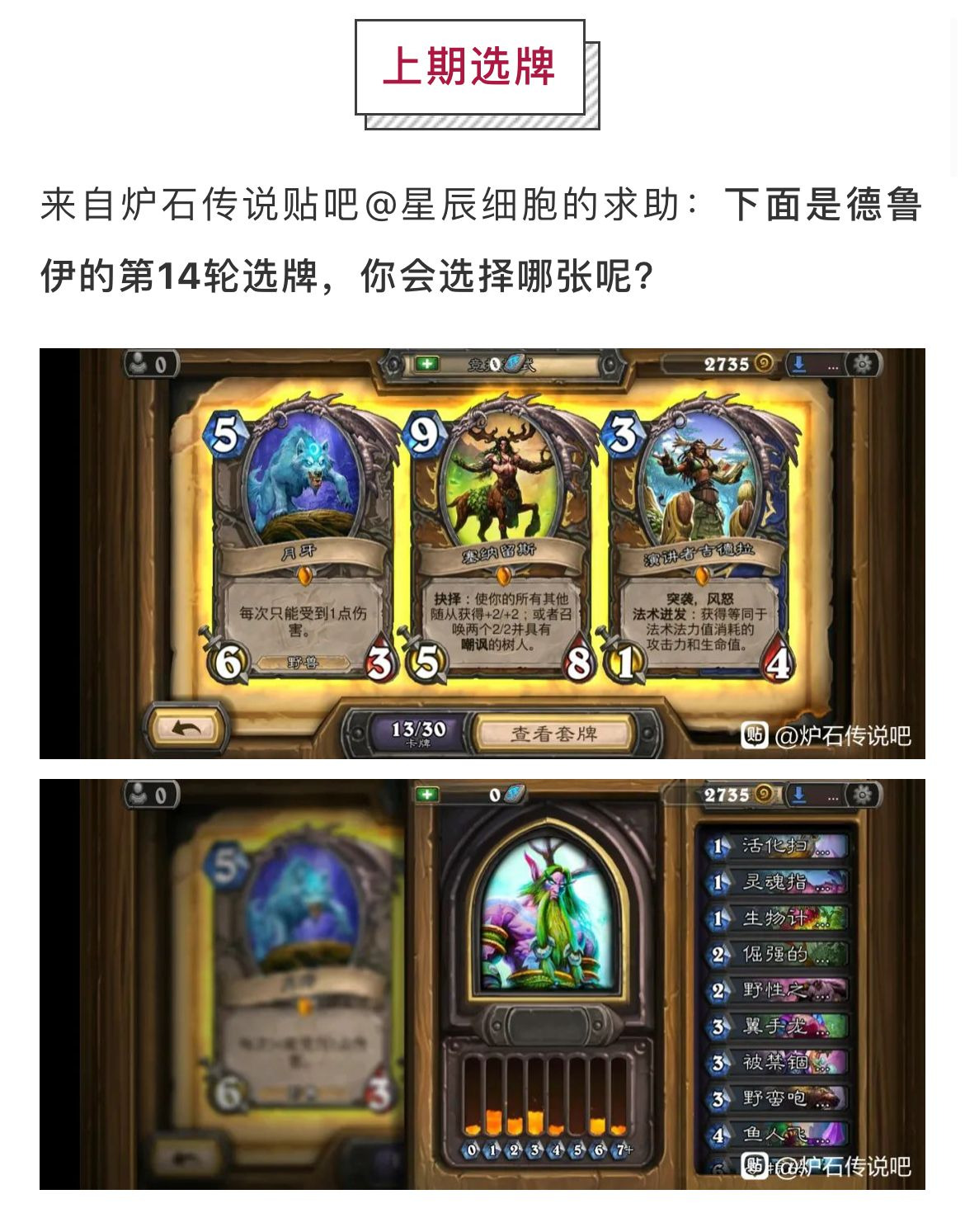 首先我们排除塞纳留斯(强度太低),月牙和3费螃蟹骑士(误)就看个人喜好了。月牙站场能力强但是惧怕铺场快攻和663食腐破坏魔。而吉德拉阿里强烈推荐,不仅操作手感极佳,也是逆境翻盘的好帮手!德鲁伊的横扫星火出现率是很高的,经常能解完场之后还有一个高攻风怒怪让对手头疼,有概率单刷对手;即使没有很多大法术,吉德拉配合已选到的咆哮也可以制造一个4攻风怒帮你过墙斩杀。