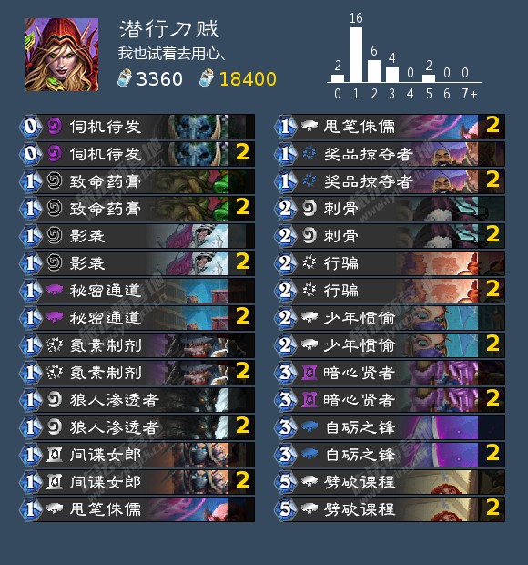 来自营地老哥 因为太阳会发光阿(战网id:我也试着去用心、)投稿的一套造价相当低廉,十分适合最后阶段用来冲分的潜行刀贼,他使用这套卡组以66%左右胜率9星开打打上传说。以下介绍主要来自我也试着去用心、: