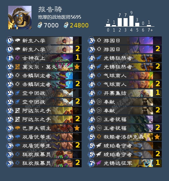 来自营地老哥 宽厚的战地医师5695(战网id:暴躁之鼬)投稿的一套报告骑,他使用这套卡组以25-10的战绩打上传说。