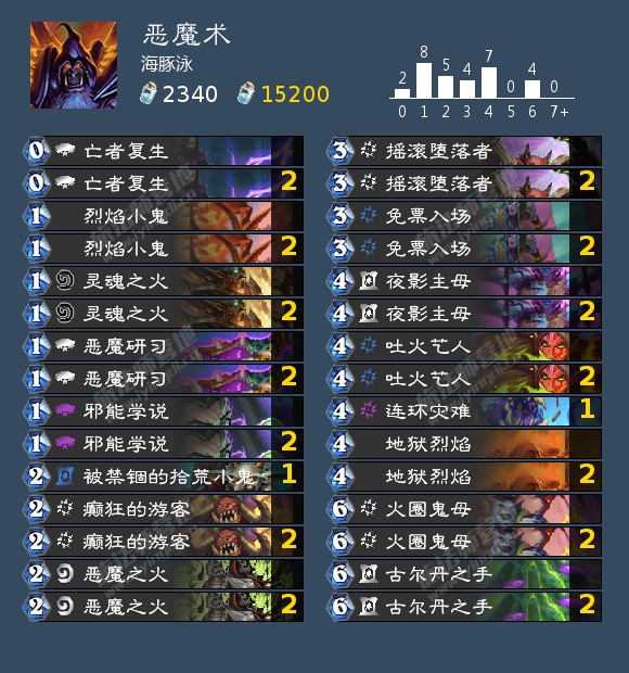 来自营地老哥海豚泳的一套恶魔术,他使用这套造价相当低廉的卡组连续多个月上传说,总对局数上千场,最近一百余场胜率60+。