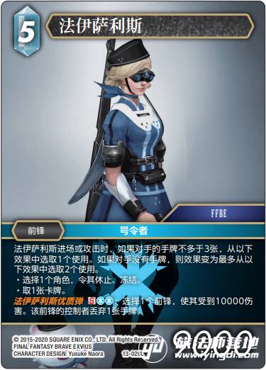 大家好,我是景山。这是我第2次在Opus第XIII部《水晶之辉》的“每周一牌”与大家见面,请多指教。第一次,我介绍了光暗属性的传奇卡牌,这次我将针对冰属性的传奇卡牌【13-028L】法伊萨利斯进行说明。法伊萨利斯是《最终幻想 勇气启示录》的登场人物,她性格开朗、战斗能力高超,这是她首次在《FFTCG》中亮相。原作中,她是主人公队伍中的一名主力,这个角色在卡牌游戏中是如何设计的呢?我们一起看看吧。